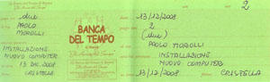 Il computer s’era bloccato a causa di un virus. Marco, che con la tecnologia non va tanto d’accordo, ha chiesto aiuto alla Banca del Tempo, che fra i correntisti ha scovato Paolo. Dopo un paio di giorni, all’uscita dall’ufficio, si è fermato da Marco per le “cure” informatiche, pagate con un assegno di un’ora e l’offerta di un aperitivo. Per pubblicizzare feste e iniziative varie, la Banca del Tempo chiede a una socia giornalista di stendere i comunicati-stampa, in cambio di un paio d’ore che la stessa potrà poi spendere come vuole.