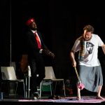 Secondo Rau il fulcro sono invece le vicende di migranti più o meno rocambolescamente approdati a Vienna, che raccontano in prima persona le loro vicende, anche se rappresentate in modo antioleografico – anzi, nello spettacolo la crudeltà serpeggia ovunque – nel tentativo di rispondere all’interrogativo di fondo se l’arte abbia un’utilità sociale o non contribuisca, piuttosto, a rafforzare lo “status quo”. Ci sono pertanto citazioni iconografiche ben precise, come il famoso quadro di Delacroix sulla libertà che guida il popolo (qui a sventolare la bandiera rossa non è una donna, ma un nero arrampicato sui cadaveri dei nemici bianchi), o l’altrettanto celebre dipinto di David, dove il posto di Marat è preso dallo stesso Tito. Del resto nello spettacolo anche l’imperatore romano viene rappresentato come un pittore o, forse, un mercante d’arte alla ricerca di qualche nuovo talento da scoprire e, dunque, da trasformare in merce. La scena rotante di Anton Lukas, che alterna un interno borghese a una squallida baraccopoli in cui vivono accampati dei senzatetto, non fa che sottolineare ancor più la distanza tra questi mondi, dove anche l’intenzione di entrare in empatia con gli emarginati è destinata a fallire.