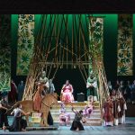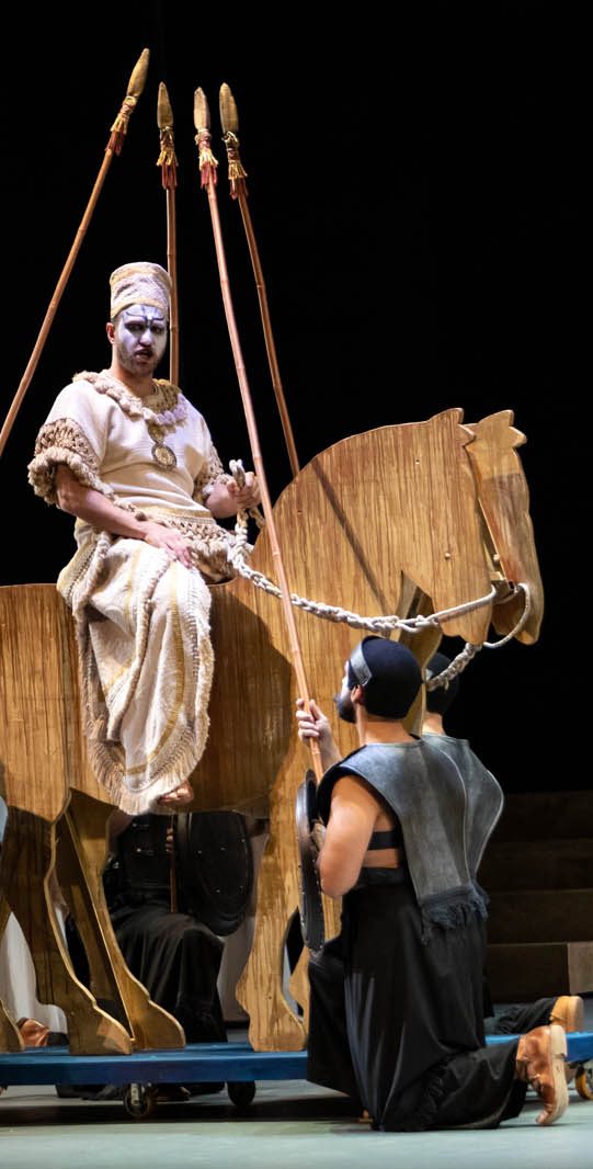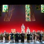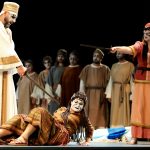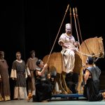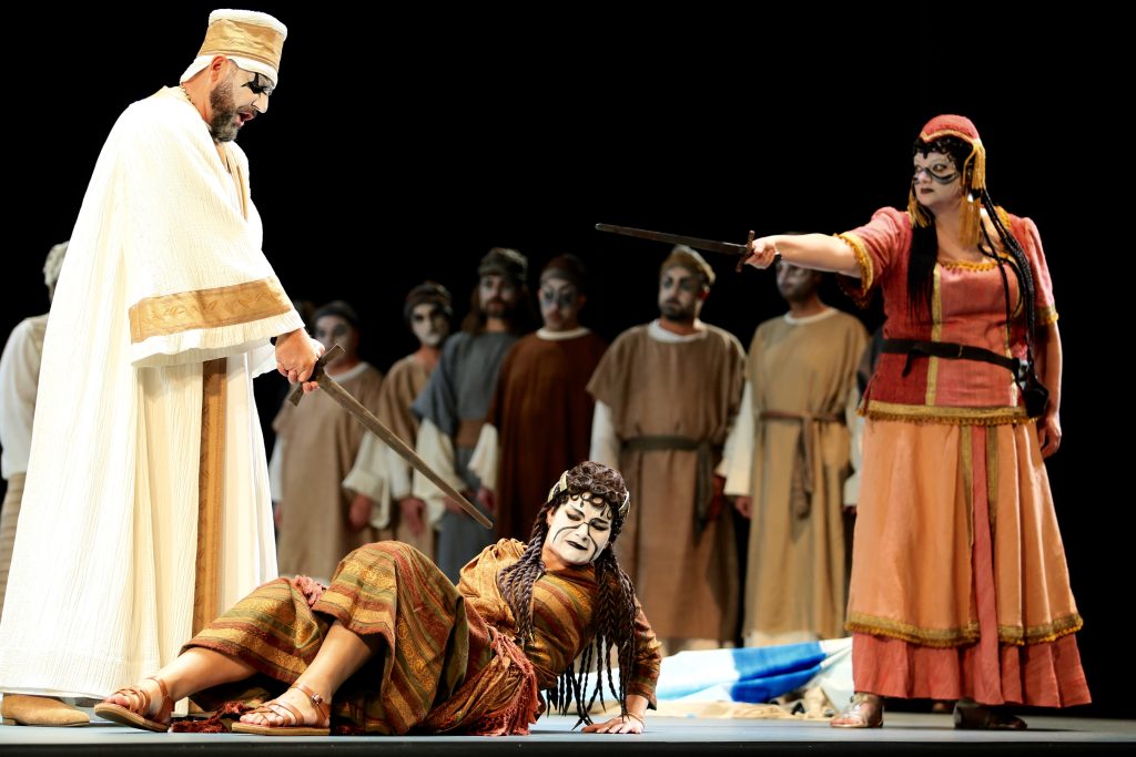 Lo spettacolo del regista Mariano Bauduin lascia giustamente fuori la simbologia ebraica – non è questo il momento storico più opportuno per chiamarla in causa – e vira verso una cornice astratta, con l’intenzione di valorizzare gli aspetti oratoriali, e dunque rituali, dell’opera. Per questo si affida a tenui citazioni del teatro orientale, visibili nel trucco di qualche interprete e negli abiti realizzati da Stefania Cempini. La scenografia essenziale di Lucio Diana, che firma pure la suggestiva illuminazione, propone come elemento più caratterizzante un cavallo di legno su ruote, che viene diversamente orientato a seconda degli equilibri di potere, trasmettendone in modo efficace l’idea di mutevolezza. Una cornice semplice e realizzata in economia di mezzi, ma una volta tanto non è un problema, visto che il punto di forza dello spettacolo resta la bacchetta di Ráth. Sarebbe auspicabile, anzi, avere più spesso l’occasione per ascoltarlo in Italia.
