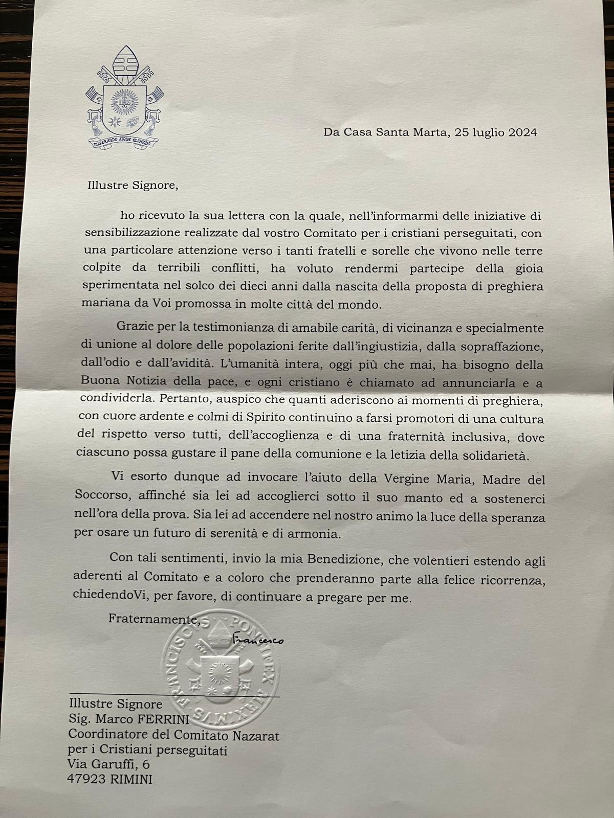 Da qui l’iniziativa che va avanti ogni 20 del mese “senza soluzione di continuità. Abbiamo radunato la sera in piazza migliaia di persone per la recita del rosario e l’ascolto di decine di testimonianze di persone che vivevano e condividevano l’esteso fenomeno della persecuzione e della discriminazione dei cristiani. Partecipando a questo momento, alcuni amici in vacanza a Rimini, hanno riproposto il gesto anche nelle loro città d’origine”. Inoltre, sottolineano gli organizzatori, “abbiamo anche raccolto una somma considerevole di denaro che abbiamo donato tutta ai cristiani del Medio Oriente che, costretti ad abbandonare le loro case e si sono quindi ritrovati poveri di tutto. Non però della tanta riconoscenza verso coloro che avevano iniziato a pregare con e per loro. Ci dissero, da subito, che avevano bisogno di preghiere, prima ancora di ogni altra cosa materiale e di denaro. Così nel tempo s’è allargata l’area geografica del nostro interesse e abbiamo subito aggiunto l’intenzione di invocare la pace, aderendo fra l’altro all’appello alla preghiera e al digiuno lanciato dal patriarca latino di Gerusalemme Pierbattista Pizzaballa, insieme a tutti gli altri Ordinari della Terra Santa, fatto proprio da papa Francesco e da tutta la Chiesa.