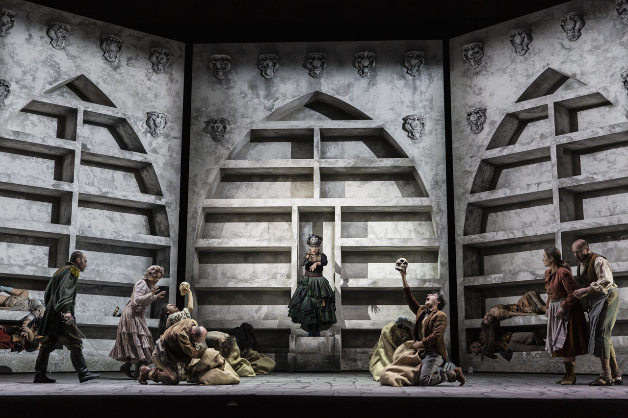 Emma Dante costruisce attorno ai personaggi (con l’aiuto delle scene di Carmine Maringola e dei costumi di Vanessa Sannino) una cornice da mortifero sottosuolo che evoca, anziché la Germania del XVI secolo del libretto, un Sud-Italia in cui si stratificano molteplici archetipi antropologici. Il rischio è che si rimanga frastornati dall’eccesso di immagini, in una sovrapposizione di simboli visivi che talvolta si sovrappongono a quelli del libretto, sebbene alcune arrivino potentissime: la suggestiva tavola che lievita, con la protagonista intenta a suonare al violino alcune pagine di una partitura rimasta a lungo ignota, e soprattutto quella finale, dove Renata – anziché salire sul rogo per la condanna dell’Inquisitore – si trasforma in una Madonna con il cuore trafitto dalle spade, aggiungendovi l’ultima che le porge lo stesso Angelo.