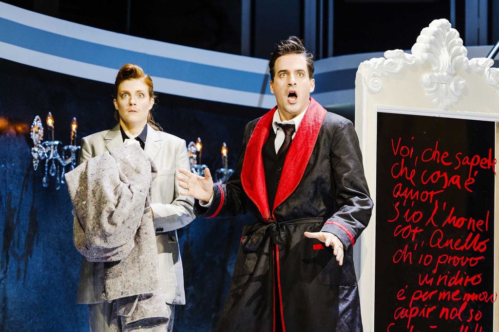Cantanti dunque credibili come attori, un po’ più in difficoltà – invece – nel rendere in modo icastico i meravigliosi versi di Da Ponte e le sue invenzioni linguistiche (risulta incomprensibile che questo grandissimo poeta non venga inserito nelle antologie scolastiche di letteratura italiana): non è vero infatti che la “parola scenica” nasca con Verdi – lui le darà soltanto il nome – perché incisività e divertita insolenza della battuta sono già perfettamente delineate nei libretti dapontiani scritti per Mozart.