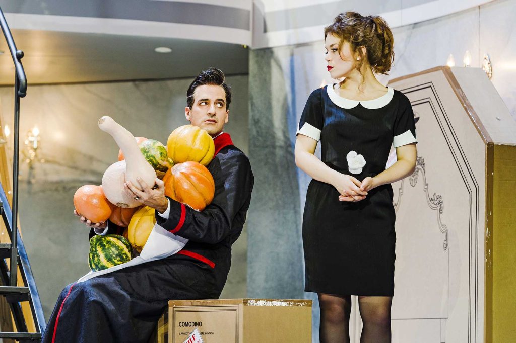 Lo spettacolo del regista Gil Mehmert, andato in scena al Teatro Comunale di Bolzano per la stagione d’opera 20.21 organizzata dalla Fondazione Haydn e frutto di una coproduzione con Lipsia, ambienta il capolavoro mozartiano in un’atmosfera vagamente anni sessanta-settanta (leggibile soprattutto nei costumi di Falk Bauer): un periodo di cambiamenti non tanto politici e sociali, ma soprattutto di costume. La principale preoccupazione registica sembra però quella di mettere in risalto il perfetto intreccio offerto dal libretto, sfruttando la scena fissa di Jens Kilian ed Eva-Maria van Acker – con tante piccole stanze disposte in verticale – che costringe i personaggi a un frenetico dinamismo, sincronizzato con cura. E l’enfasi profusa anche nella gestualità degli interpreti ne accentua ancor più l’aspetto da commedia brillante: appunto quello de La folle journée.