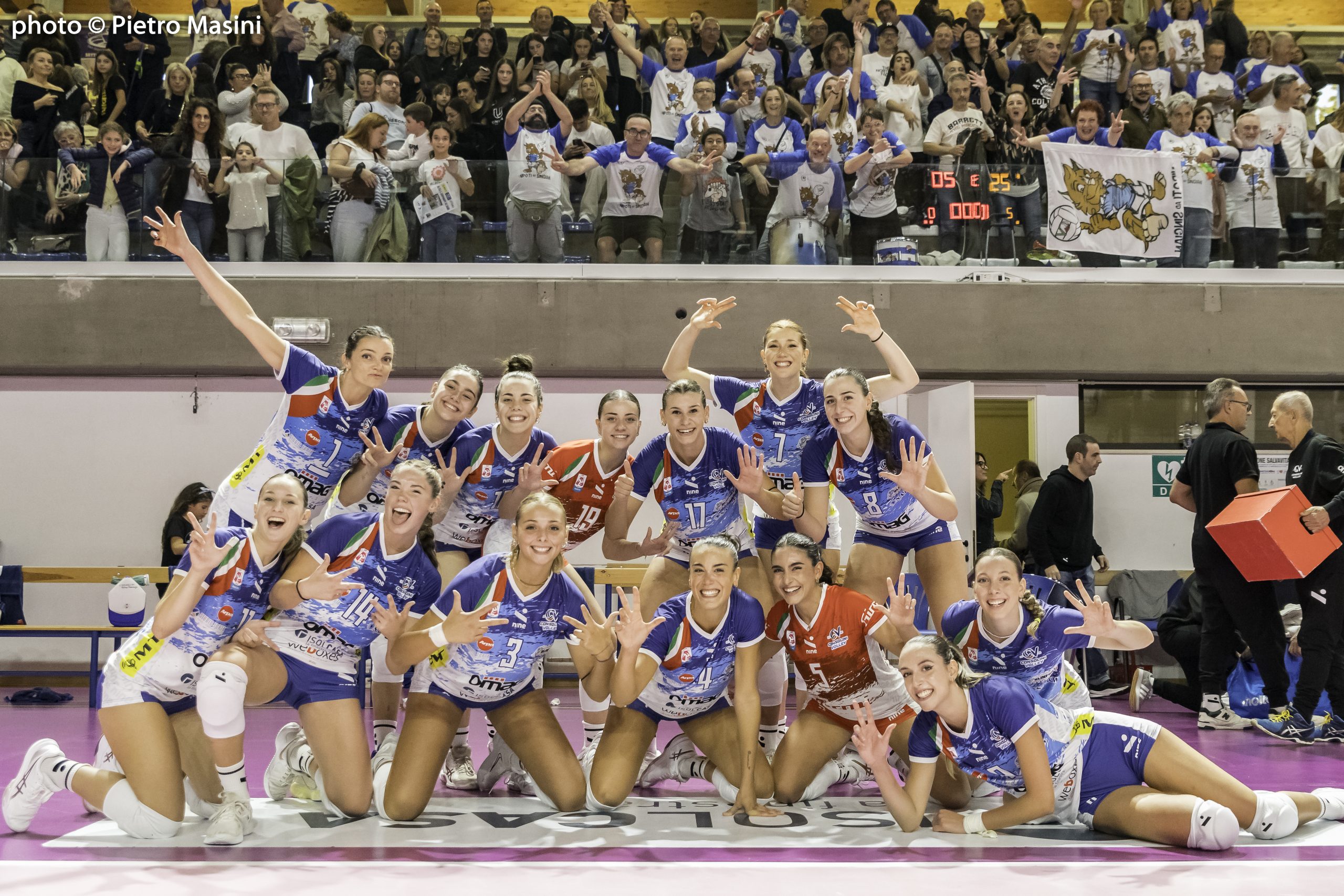 Ci ha impiegato poco più di un’ora Omag-Mt per battere Cbl Costa Volpino (3-0) e regalarsi i primi tre punti del campionato. Una Consolini al limite della perfezione che non ha mai sofferto se non nella fase centrale del terzo set dove, però, è riuscita a stare in partita capovolgendo la situazione. Ottima in cabina di regia Cecilia Nicolini che ha distribuito il gioco alla perfezione smarcando a turno le sue ‘bocche di fuoco’, bravissima in difesa e in ricezione Sofia Valoppi mentre Alice Nardo, eletta MvP, ha messo a terra 13 punti, uno in meno di Serena Ortolani che, come sempre, ha illuminato il Pala Marignano. Determinanti al centro Sveva Parini e soprattutto una Claudia Consoli in formato extra lusso sia con la sua fast sia a muro.