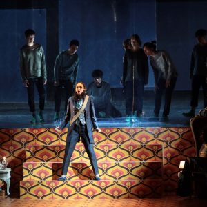 Lo spettacolo di Gabriele Vacis parte da un’efficace idea per rendere plausibile la problematica presenza di personaggi maschili en travesti, tanto più che in questo caso c’è anche una principessa, Amastre, che si camuffa da uomo per riconquistare Serse di cui è innamorata. Come se si trovassero nel camerino di un teatro, con tanti specchi in primo piano, gli interpreti giungono in palcoscenico in abiti da sera, quindi indossano gradatamente i costumi – davvero belli e spiritosi – firmati da Roberto Tarasco, autore anche di luci e scene (peccato solo per la tappezzeria anni settanta, bruttina e un po’ troppo presente). Tutto si svolge al proscenio, mentre su un piano sopraelevato vengono proiettate immagini che elaborano il tema della vegetazione – il pretesto è fornito dal platano menzionato nel Largo – e dove agisce un nutrito gruppo di ragazzi, coreografati secondo diverse modalità: gli effetti talvolta sono suggestivi, soprattutto quando gli alberi sembrano germinare dalle loro teste, altre volte meno, provocando inutili distrazioni di fronte a una trama intricata, che invece richiederebbe massima attenzione.