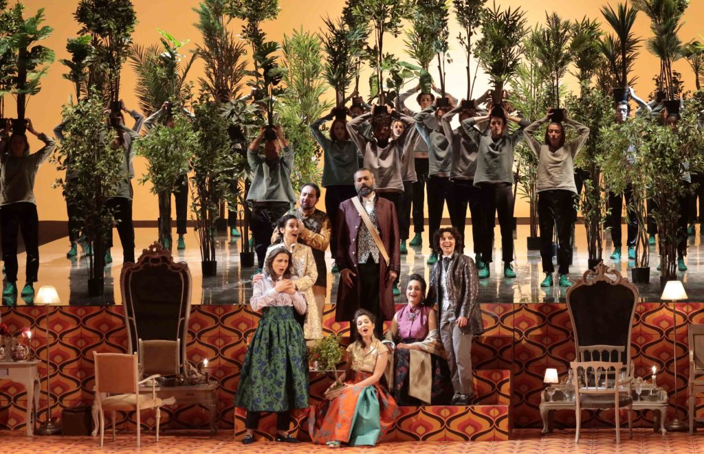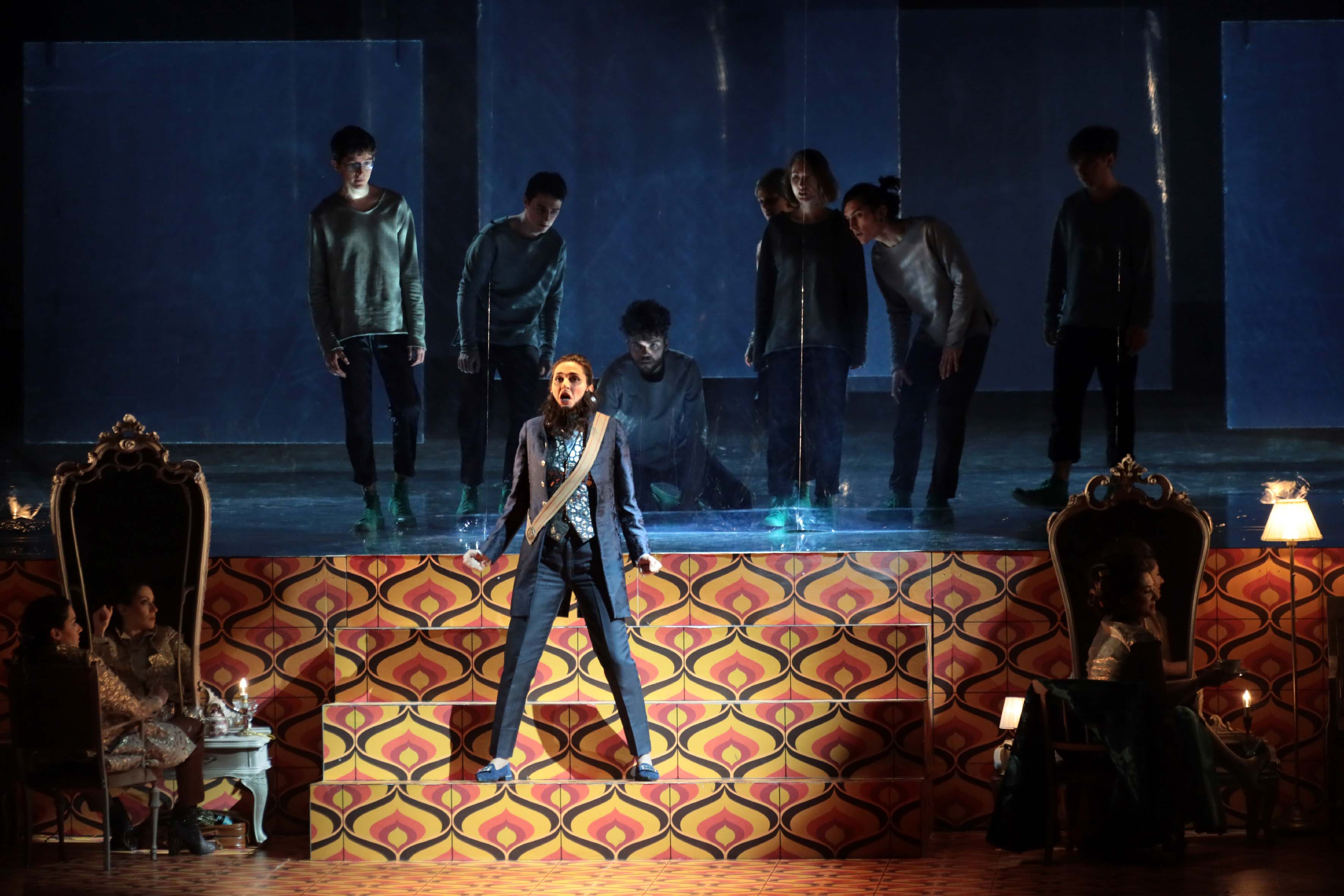 Lo spettacolo di Gabriele Vacis parte da un’efficace idea per rendere plausibile la problematica presenza di personaggi maschili en travesti, tanto più che in questo caso c’è anche una principessa, Amastre, che si camuffa da uomo per riconquistare Serse di cui è innamorata. Come se si trovassero nel camerino di un teatro, con tanti specchi in primo piano, gli interpreti giungono in palcoscenico in abiti da sera, quindi indossano gradatamente i costumi – davvero belli e spiritosi – firmati da Roberto Tarasco, autore anche di luci e scene (peccato solo per la tappezzeria anni settanta, bruttina e un po’ troppo presente). Tutto si svolge al proscenio, mentre su un piano sopraelevato vengono proiettate immagini che elaborano il tema della vegetazione – il pretesto è fornito dal platano menzionato nel Largo – e dove agisce un nutrito gruppo di ragazzi, coreografati secondo diverse modalità: gli effetti talvolta sono suggestivi, soprattutto quando gli alberi sembrano germinare dalle loro teste, altre volte meno, provocando inutili distrazioni di fronte a una trama intricata, che invece richiederebbe massima attenzione.