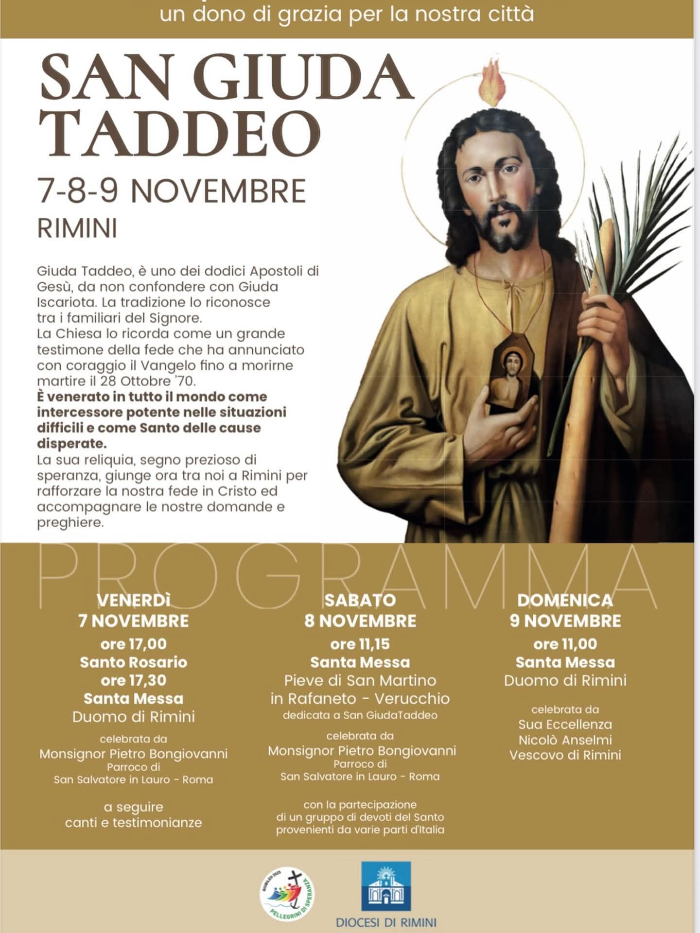 La reliquia è esposta da stamattina in cattedrale a Rimini, ma il triduo si apre venerdì 7 novembre alle 17 con rosario, Messa e alcune brevi testimonianze di grazie ricevute. Sabato mattina la reliquia sarà portata nella Pieve di San Martino in Rafaneto, a Verucchio, dove alle 11 sarà celebrata la Messa. La cornice è quella di una chiesa romanica di rara bellezza. In occasione della ristrutturazione, padre Sergio Ferrini, frate originario di Forlì che nutriva una profonda devozione per san Giuda, volle ricordarlo. «È un luogo meraviglioso – spiega Teresa –. All’esterno c’è la statua del Santo, all’interno immagini e segni della sua presenza. È come se fosse la sua casa in Romagna». Attorno a quella Pieve, negli anni, si è formato un piccolo gruppo di fedeli provenienti da varie regioni, ma legati alla figura di padre Ferrini, che si ritrova due volte l’anno, in marzo e in ottobre, a pregare e che sarà sabato alla Messa. Il triduo si concluderà domenica con la messa delle 11 in cattedrale celebrata dal vescovo Nicolò Anselmi.