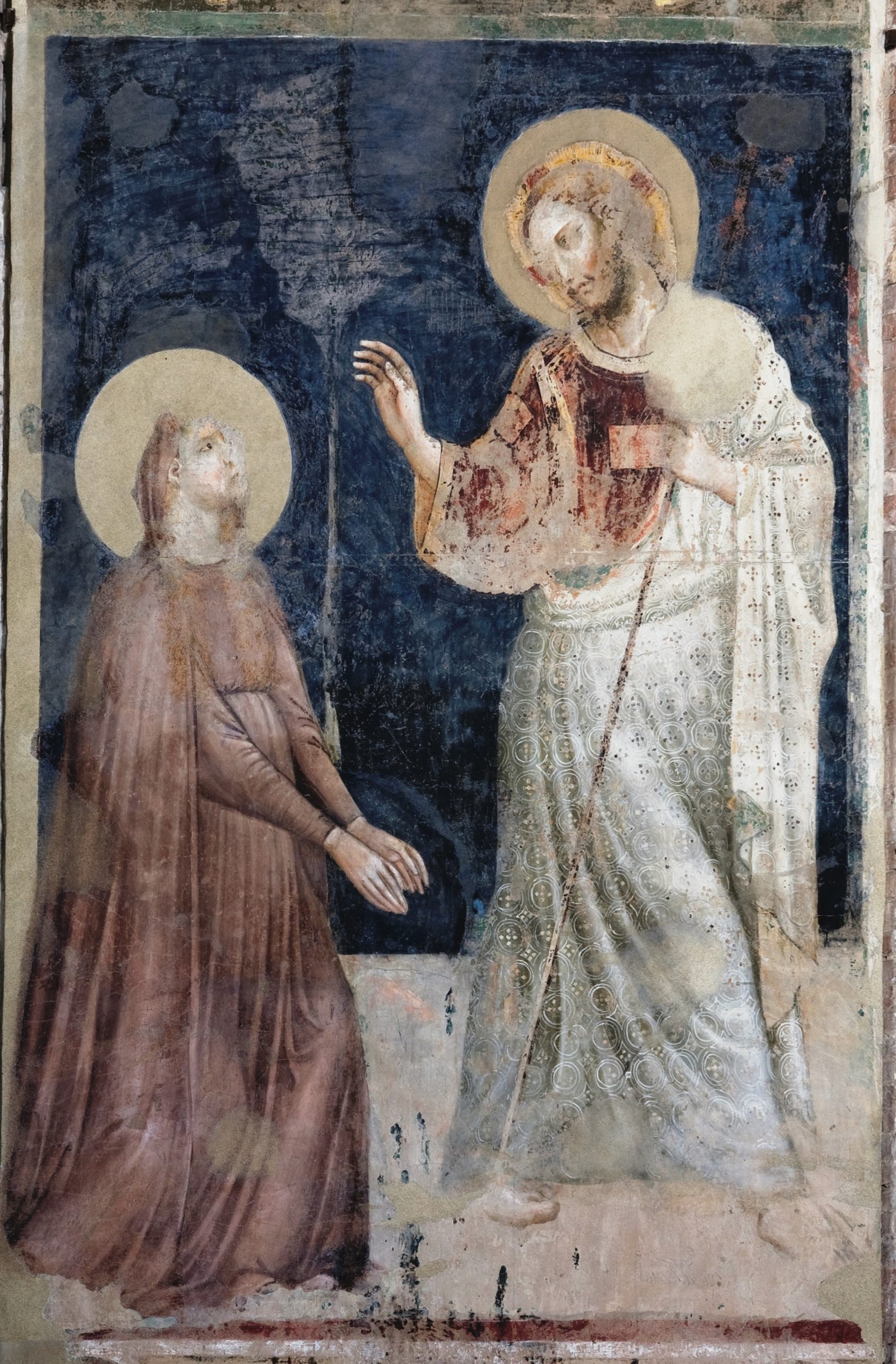 Sulle spalle, Gesù porta un mantello bianco e sfolgorante, trapunto di cerchi e losanghe su cui fioriscono piccole forme cruciformi a foglia d’oro. Il Risorto regge una lunga e rossa verga crociata, come nelle raffigurazioni antiche e bizantine della Discesa agli Inferi: la Croce vince la morte e l’Inferno. Il manto si mostra candido e abbagliante, come le vesti di Cristo nell’episodio della Trasfigurazione sul monte Tabor in cui si è palesata la sua di- vinità (Mt 17, 1-8; Mc 9, 2-8; Lc 9, 28-36; 2Pt 1, 16-17). Al tempo il Signore si era rivelato solo ai tre apostoli prescelti, Giacomo, Giovanni e Pietro, che dovettero custodire il segreto fino al giorno della resurrezione; ora Maddalena è incaricata di annunciare il mistero: una donna è apostola tra gli apostoli, ha vistoper prima ciò che gli altri conosceranno solo dopo. La scena avviene nell’orto cimiteriale dove si trova il sepolcro di Gesù: un giardino descritto con alberelli ormai poco visibili e di cui il Salvatore è creduto il custode dalla Maddalena. Un saggio fraintendimento: non è forse Cristo il Verbo con cui Dio ha creato l’Eden, e non è Egli il Nuovo Adamo, custode del Paradiso?