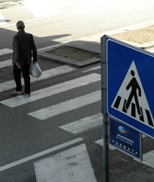 “Per i pedoni il consiglio è quello di camminare sui marciapiedi e, se non ci sono, sul lato sinistro della strada, in senso opposto alla direzione di marcia dei veicoli. Oltre ad accorgersi di un eventuale pericolo, il pedone sarà visibile ai conducenti. Il pedone deve dichiarare l’intenzione di attraversare rendendosi visibile, alzando il braccio se è necessario. Per attraversare la strada è necessario osservare la regola dei quattro sguardi: guardare prima a sinistra, poi a destra, e iniziare l’attraversamento quando la strada è libera. Poi si deve procedere decisi e controllare ancora a sinistra e a destra che non sopraggiungano veicoli. Infine attraversare sempre dietro l’autobus in modo da essere visibile agli altri conducenti”.