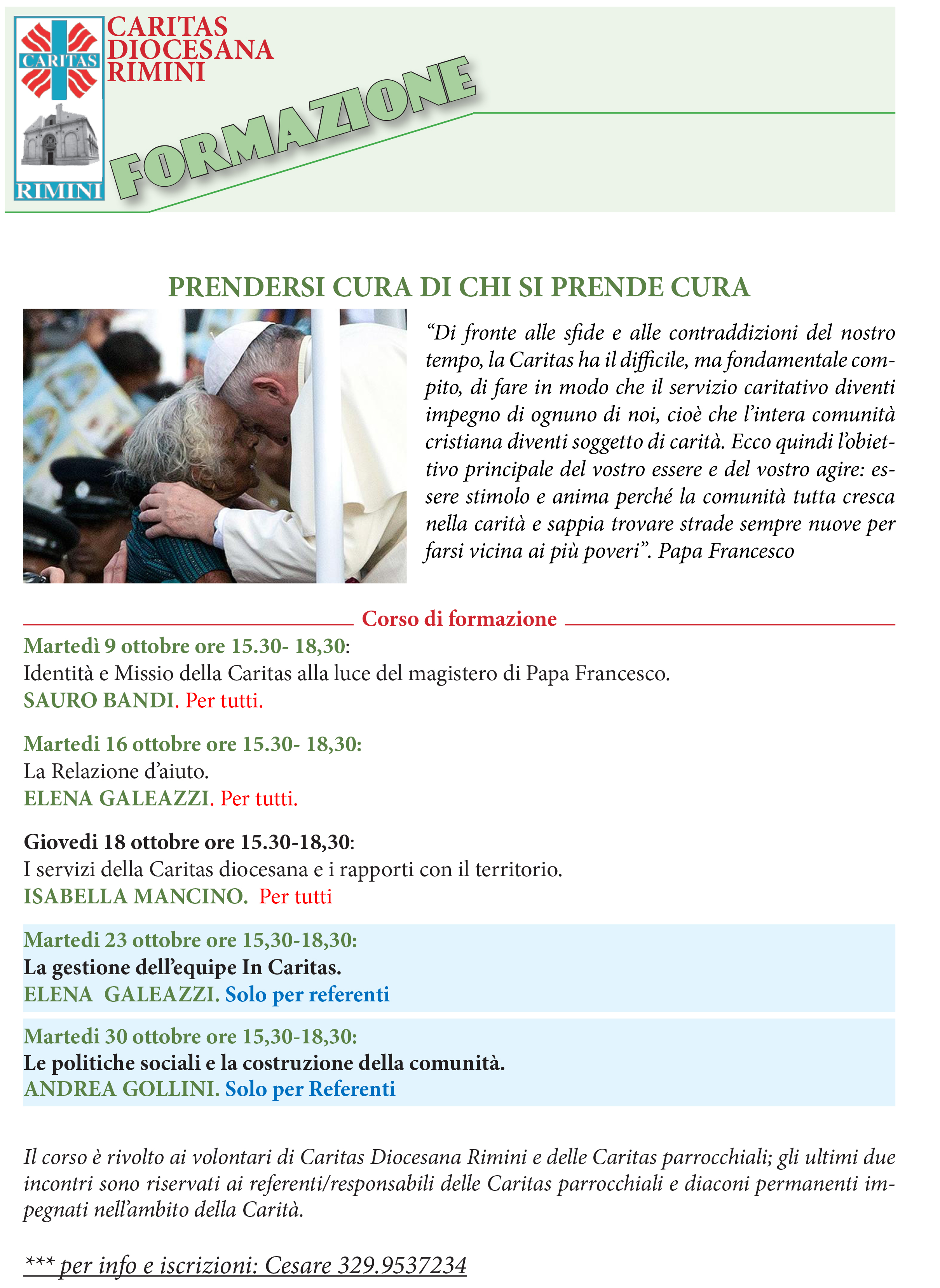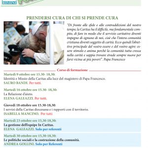 Il corso di formazione Prendersi cura di chi si prende cura, che la Caritas diocesana organizza per volontari e responsabili delle Caritas parrocchiali, vuole aiutare a operare partendo dalla lettura delle situazioni sempre più complesse nelle quali oggi ci troviamo. L’auspicio è quello di accompagnare chi opera nell’ambito della carità in un cammino che oggi richiede due passaggi fondamentali.
