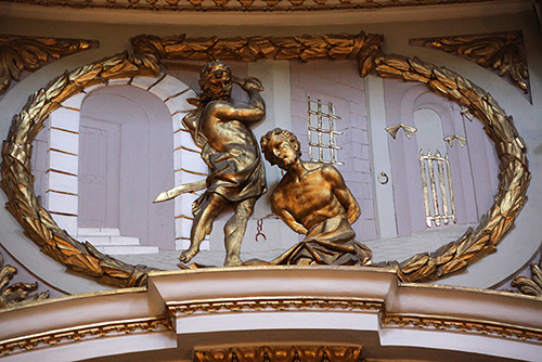 A chi percorre l’antica “via maestra”, cioè il Corso d’Augusto, fra la piazza del Comune e il ponte di Tiberio, la chiesa dei Servi si presenta con un fianco costituito da una muraglia compatta e regolare, senza finestre, ritmata da semplici lesene che si innalzano da un basamento di gusto medievale. Né questo fianco, né la facciata classicheggiante, alta su una piazzetta esigua, lasciano prevedere il fastoso interno della chiesa.