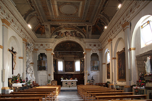 Fino all’inizio dell’Ottocento la chiesa è stata dedicata solo a san Marino; è molto antica e all’esterno reca chiari segni dei rimaneggiamenti subiti. Sulla facciata sono ben visibili due alte monofore gotiche cieche, ripristinate durante i restauri seguiti al terremoto del 1916; affiancano la finestra centrale che è molto più tarda (e che sostituisce un modesto rosone) e sovrastano il portale settecentesco; monofore simili e ugualmente cieche compaiono sui fianchi, il cui paramento murario compatto e uniforme (benché visibilmente ripreso in molti punti) è dovuto ad un accurato ripristino. L’abside, fondata sulle mura urbiche romane, è cinquecentesca, ma sorretta da contrafforti moderni, e moderno è pure il campanile.