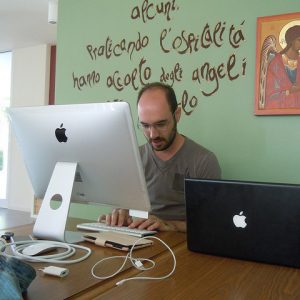 “All’inizio nacque Telefono Amico e Chat Amica come forma di servizio agli adolescenti in difficoltà o in ricerca. Già nel nostro statuto avevamo scritto: ‘servizio di aiuto tramite telefono e chat viene svolto da gruppi che, attraverso la disponibilità, l’amicizia piena e disinteressata, si prefiggono di dare a tutti la possibilità di trovare una persona aperta all’ascolto e al dialogo e pronta a venire incontro alle tensioni nel momento stesso in cui sorgono’. Il servizio non aveva alcuna accoglienza se non l’ascolto, il dialogo, senza, senza nessuna pretesa o fine terapeutico. Poi è nata la Posta di Madre Badessa che negli anni è passata da bacheca a quaderno spirituale. Lì sono inseriti di tanto in tanto i commenti ai Vangeli del giorno scritti dai ragazzi del Punto Giovane. Naturalmente oggi è il tempo dei social network, per cui siamo presenti in tutte le modalità comunicative delle nuove generazioni anche su acebook, Twitter, Instagram… per essere sempre collegati in tempo reale! Anche le nostre liturgie vanno in streaming per permettere anche a chi non può essere presente fisicamente di pregare con noi. Naturalmente su Youtube é presente un canale dedicato, un ricco archivio di video “intramontabili”…in modo speciale quelli relativi alle convivenze dei ragazzi! L’ultima proposta è Pregaudio che in due anni ha già raggiunto il numero di più di 2 milioni di preghiere ascoltate e di 15.000 utenti” (vedi scheda a parte).