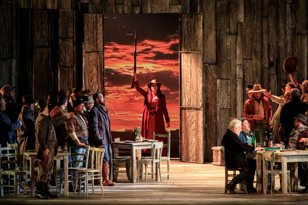 L’opera, purtroppo di rara rappresentazione, ha inaugurato la stagione lirica bolognese – una sorta di coda dell’anno pucciniano appena concluso – nel nuovo allestimento firmato dal regista Paul Curran, con le scene e i costumi di Gary McCann, che è riuscito a utilizzare in modo efficace le abnormi proporzioni del Comunale Nouveau. Rispettoso delle indicazioni pucciniane (il compositore era sempre molto attento a definire i dettagli scenici), lo spettacolo ricrea nel primo atto il saloon «Polka», gestito da Minnie, dove si raduna un microcosmo di minatori venuti a tentare la fortuna in California, e nel secondo ricostruisce l’abitazione della protagonista. Solo nel terzo si allude al futuro, delineando silhouette verticali stilizzate, quasi a significare l’evoluzione di una foresta dove torri e grattacieli metropolitani prenderanno il posto degli alberi: una trasformazione speculare al cambiamento di valori della società. Nella sua appassionata arringa Minnie riesce infatti a convincere i minatori a non impiccare l’uomo che ama, facendo leva sul fatto che a tutti bisogna concedere una seconda possibilità: insegnamenti evangelici oggi irrimediabilmente messi in discussione.