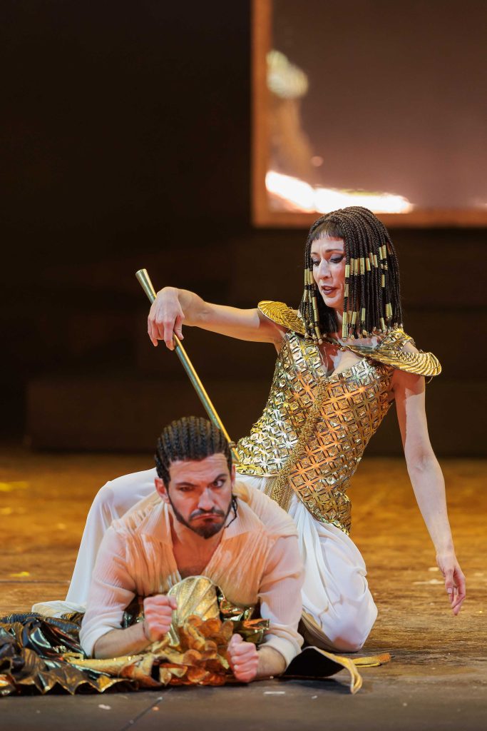 Lo spettacolo portava la firma di Chiara Muti, che si è avvalsa della scena – in cui prevalgono le sfumature dorate – di Alessandro Camera, rappresentata da un enorme volto, scomponibile, adagiato sul palcoscenico (proiezione della testa di Pompeo?). Pregevoli pure i costumi di Tommaso Lagattolla e molto suggestiva l’illuminazione di Vincent Longuemare. La bussola della regista è palesemente Shakespeare, il cui Julius Caesar precede di quasi un secolo e mezzo l’opera di Händel, tanto che appaiono ben leggibili due citazioni del Bardo: da una parte un Sesto nerovestito che, sulla scia di Amleto, osserva un cranio meditando vendetta; dall’altro una Cleopatra che, nell’intento di sedurre Cesare sotto le mentite spoglie di Lidia, riecheggia Titania del Sogno di una notte di mezza estate, alle prese con la testa d’asino di Bottom.