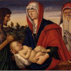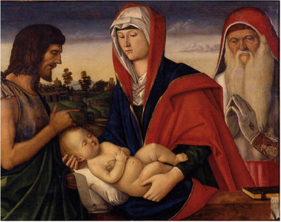 Il Battista dimora dalla parte di chi contempla, ma anche le vesti di Maria, il cuscino, il corpo di Gesù si sporgono dalla balaustra verso chi guarda e prega, a renderlo partecipe del colloquio silente e del mistero. Il cerchio si chiude e riapre con Girolamo, raffinato umanista, traduttore e commentatore di quelle Scritture dove la Parola divina è stata custodita prima e dopo l’Incarnazione. Dalla Voce al Verbo e dal Verbo al commento; e dal commento alla contemplazione del Cristo infante, il Verbo nella carne, compimento delle voci profetiche. Girolamo in preghiera, è colui che continua lo sforzo spirituale verso Cristo, fulcro e perno della storia intera.
