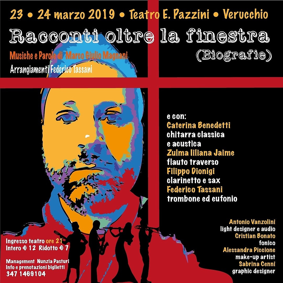 Un lavoro biografico e allo stesso tempo autobiografico, che si alterna alla denuncia sociale trattando tematiche, oltre che attuali, vicine alla sua esperienza. Lo spettacolo vedrà lo stesso Magnani alle prese con la parte recitativa, accompagnato da Caterina Benedetti alla chitarra, Zulma Liliana Jaime al flauto traverso, Filippo Dionigi al clarinetto e sax, e, al trombone ed eufonio, Federico Tassani che è anche l’arrangiatore di tutti i brani. I musicisti sono stati scelti, oltre che per la loro preparazione artistica e tecnica, anche per la loro provenienza: infatti, ognuno arriva da Rimini e provincia, tranne la flautista che è di origine colombiana, ma riccionese d’adozione.