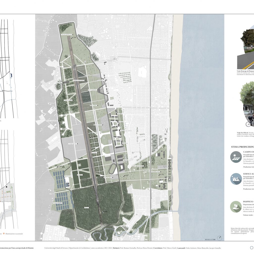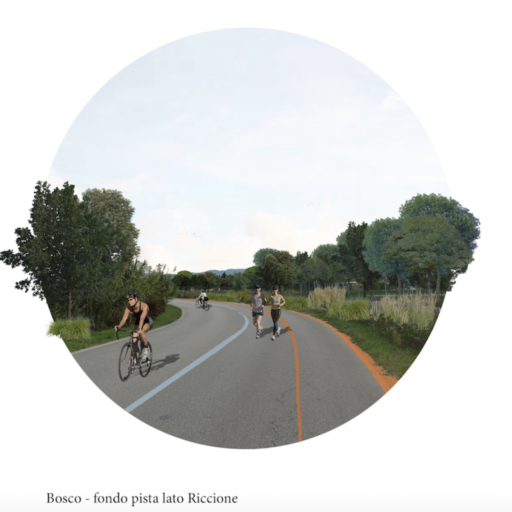 “Il progetto parte dalla demolizione degli edifici della passata vita dell’aeroporto, considerati senza alcuna valenza architettonica, e depavimentando le aree di alcune delle strade interne all’infrastruttura, in modo tale da permettere una maggiore permeabilità del suolo. L’azione permetterà di creare un sistema naturale attivo, che insieme al bosco costituirà una continuità naturale che compensa la fitta urbanizzazione della costa, aumenterà i benefici del mare nella mitigazione del clima e porterà alla definizione di un nuovo modello di sviluppo per il territorio sempre in evoluzione. Questo per spingere Rimini e chi la vive ad una nuova interazione con la natura, cosa di cui sempre più si apprende l’importanza. Infatti, tale rete è importante quanto quella dei trasporti, dell’energia e dell’acqua, e permette di integrare il nuovo polo costruito al margine rurale, per raggiungere il mare attraverso il recupero del varco delle colonie, in un organismo composito che favorisca connessione e multifunzionalità degli spazi pubblici. Inoltre, a confine con il nuovo bosco, un’ampia porzione viene destinata alla produzione di energia rinnovabile per permettere un autoconsumo nell’area ex-aeroportuale e per i bisogni della città. Ripensare l’infrastruttura sarà così occasione di creare usi alternativi e più vantaggiosi del territorio. Intervenendo, infatti, nei tre ambiti strategici, quali verde, connessioni e collettività, la città può trarre vantaggi dal punto di vista urbano, sociale ed economico. Ciò può garantire alla città la possibilità di attrarre e sostenere una comunità forte, restituendo alle persone spazi per attività informali lontani dall’artificialità e offrendo una vita che sia veramente all’insegna del wellness, dimostrandosi orientata all’inclusione sociale e al benessere sia ambientale sia collettivo”.