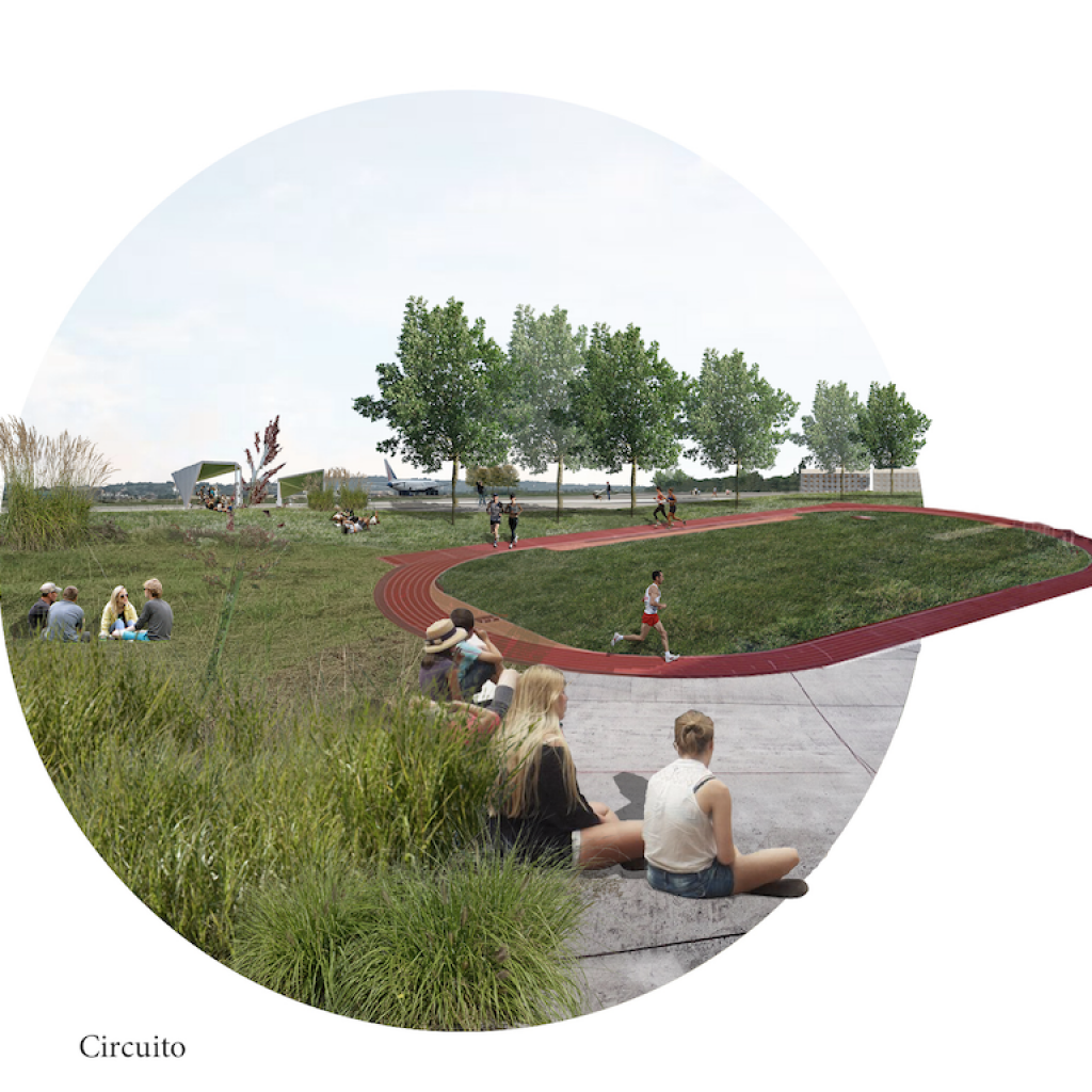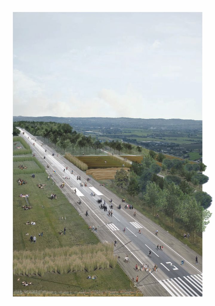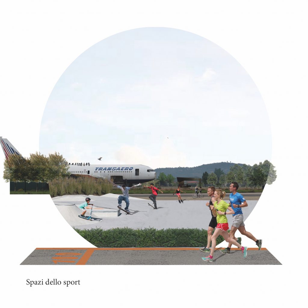 “Il progetto trasforma l’area aeroportuale in un’infrastruttura verde e si pone l’obiettivo fondamentale di ricucire l’area alla costa, ristabilendo una connessione forte e creando un sistema naturale attivo per avere una continuità naturale nella fitta urbanizzazione della costa. Abbiamo individuato tre grandi assi corrispondenti agli attuali viale Ivo Oliveti, via Antonio Meucci e viale Camillo Manfroni, che diventeranno delle trasversali verdi che collegheranno il Parco del Mare al nuovo parco urbano e che permetteranno una prima modifica della mobilità, disincentivando l’uso del mezzo privato. Il verde verrà ulteriormente incrementato con la costituzione del bosco nella parte più a sud del sito: questa azione servirà anche per potenziare il corridoio ecologico del torrente Marano. La costituzione di un parco che superi le cesure create dalla linea ferroviaria e la statale, trasformando i vuoti delle vecchie colonie marine oggi presenti in uno spazio pubblico, permetterà la salvaguardia del varco a mare e un nuovo dialogo tra le città di Rimini e Riccione. Un’importante azione strategica, inoltre, sarà destinare parte dell’area a pannelli fotovoltaici e un pioppeto per biomassa. Il margine che si confronta con l’urbano sarà occupato da una fascia costruita di alcune residenze, uno studentato e un nuovo polo universitario per la facoltà di scienze motorie che oggi è alla ricerca di una nuova sede. La grande porzione a nord in cima alla pista, sarà lasciata immutata per divenire uno spazio utilizzabile durante eventi di diverso tipo come i grandi concerti che oggi deturpano la spiaggia, o attività temporanee come le manifestazioni ‘Al Meni’, ‘Giardini d’autore’ ecc. Infine il margine con l’entroterra agricolo sarà progettato strategicamente con campi agricoli e orti urbani dati in gestione a cooperative locali, con l’obiettivo di creare un servizio che migliori la vita sociale in città e costituendo un dialogo con il rurale. Abbiamo deciso di lasciare come forte segno la pista che rimane immutata per essere riconquistata dai cittadini e, assieme a essa, la strada che perimetra oggi l’aeroporto che sarà trasformata in un grande circuito pedonale e ciclabile. L’ultima importante azione strategica prevede una modifica della mobilità, soprattutto tra la ferroviae la costa, che diminuisca il traffico carrabile e incentivi il trasporto pubblico”.