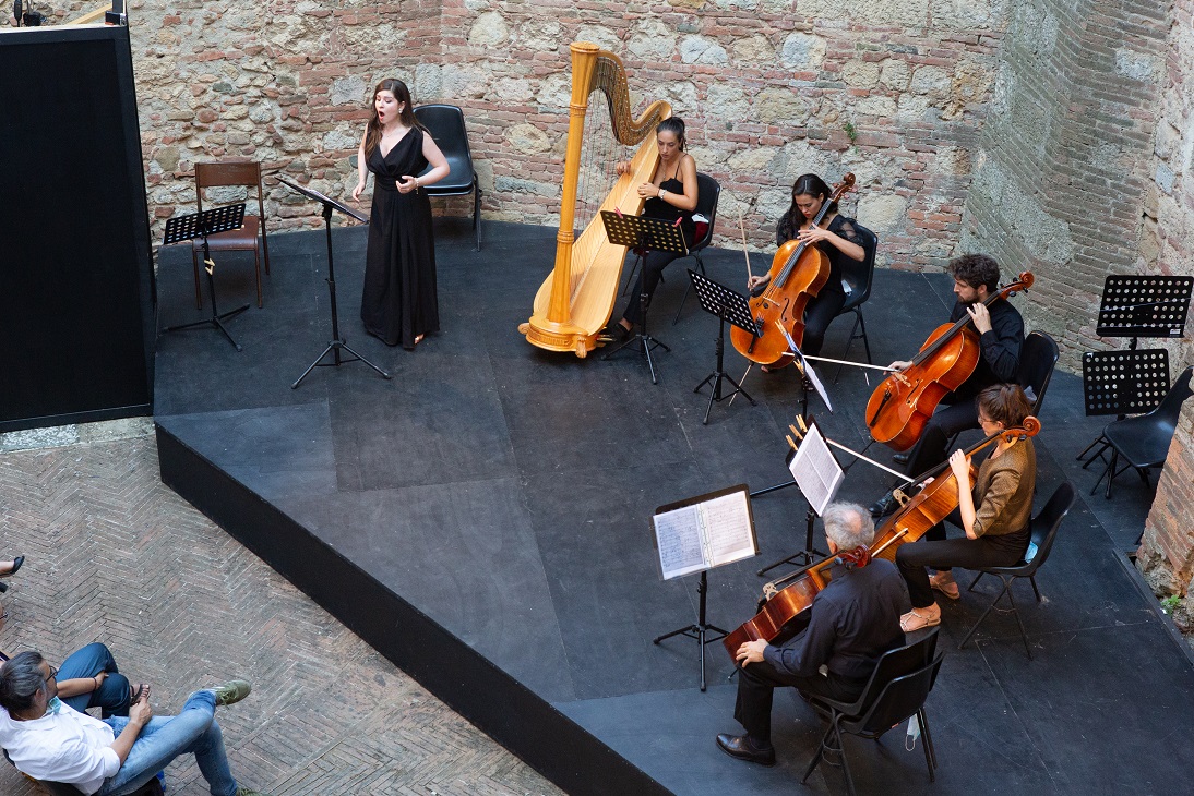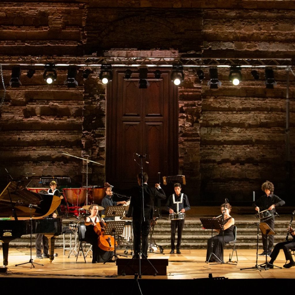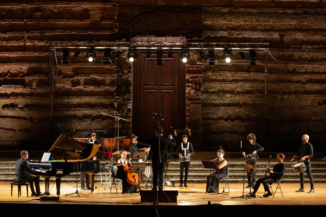 Lo spirito del compositore aleggiava poi nel concerto Echi d’istanti: quattro nuove composizioni commissionate dal Cantiere in tempi – come suggerisce il titolo – di distanziamento ed eseguite nell’amplissimo spazio della rinascimentale Piazza Grande. I brani, seppure destinati a piccoli organici, hanno richiesto l’intervento del direttore e sul podio si sono alternanti Alessio Casinovi e Roland Böer, arrivato alla conclusione del suo mandato – durato dodici anni – come direttore musicale del Cantiere. Molto suggestiva la Fanfare de la clarté du ciel del francese Olivier Durendal per tromba e percussioni; veicolo di profonde riflessioni, invece, Gravity per flauto, clarinetto, violoncello, pianoforte e percussioni dell’italiano Norberto Oldrini. Più complessa la serenata per nove strumentisti Con suoni e canti del tedesco Claus Kühnl, capace di sfruttare al meglio il luogo destinato al concerto, facendo diventare la spazializzazione fonte di effetti oltremodo affascinanti. Perfetto interprete dello spirito del Cantiere, infine, l’inglese David Paul Graham, che di Henze è stato allievo, con il suo Der Fortschrittsoptimist per flauto, clarinetto, percussioni e pianoforte, più altri otto percussionisti, di cui sei – compresi due bambini – erano studenti dell’Istituto Musicale di Montepulciano. Sia la scelta di abbinare professionisti e allievi sia quella di collocarli in alto – sulla torre campanaria del palazzo comunale che si affaccia in Piazza Grande, esasperando così il distanziamento – è stato forse il modo migliore di far rivivere “der Geist”, ossia lo spirito del fondatore.