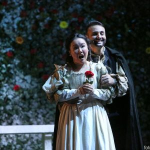 Come spesso succede per gli spettacoli di provincia, le maggiori incognite sono legate al cast. Questo non implica automaticamente che bisogna aspettarsi cantanti modesti: spesso ci si imbatte in artisti di un certo calibro – magari in fine carriera – e talvolta possono persino esserci delle sorprese, soprattutto fra quelli più giovani che stanno muovendo i primi passi. Il baritono Andrea Zese è un veterano del ruolo di Rigoletto, che ha cantato innumerevoli volte: la voce ha perso di rotondità per l’inevitabile trascorrere degli anni e la linea di canto appare nell’insieme piuttosto piatta, ma si possono ancora apprezzare i fiati e, soprattutto, gli accenti che ha saputo imprimere al personaggio. Altra fascia anagrafica quella dei coprotagonisti. Se è meglio dimenticare il tenore Carmine Riccio (Duca di Mantova), dal canto disomogeneo e spesso scompaginato, la vera sorpresa è venuta dal soprano giapponese Ayako Suo: una Gilda d’impeccabile precisione e dizione molto nitida, che non nasalizza mai i suoni – qualità tutt’altro che scontata per un’orientale – e sempre scrupolosa nel rispettare le indicazioni verdiane (ben percepibili gli ‘staccati’ di Caro nome). Paolo Battaglia è riuscito a disegnare un convincente Sparafucile, grazie a una voce che mantiene la timbratura negli affondi più gravi del personaggio e, accanto a lui, ha ben figurato Antonella Colaianni, una Maddalena dal colore autenticamente mezzosopranile. Degno di nota, fra i comprimari, solo Luca Gallo, un icastico Ceprano.