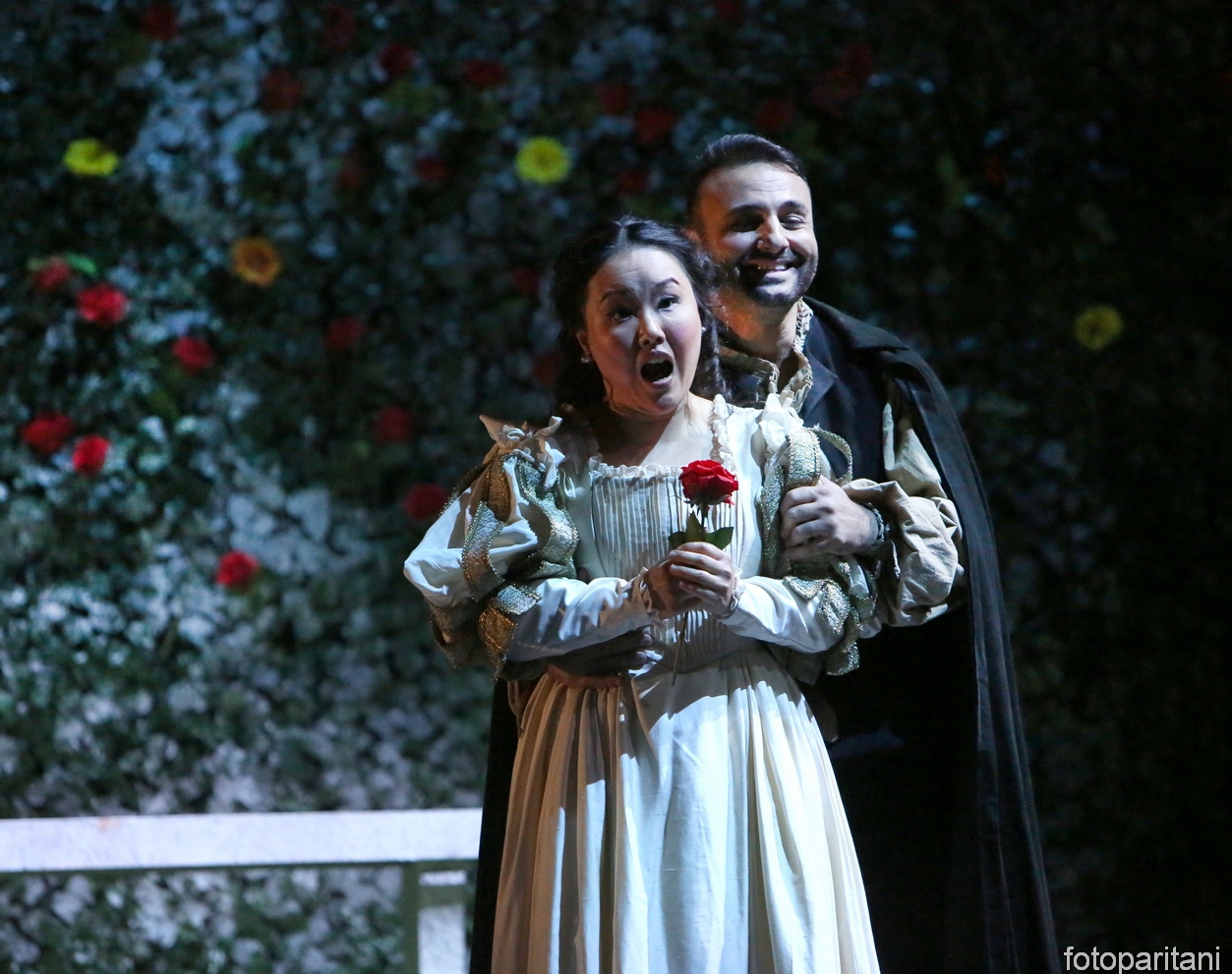 Come spesso succede per gli spettacoli di provincia, le maggiori incognite sono legate al cast. Questo non implica automaticamente che bisogna aspettarsi cantanti modesti: spesso ci si imbatte in artisti di un certo calibro – magari in fine carriera – e talvolta possono persino esserci delle sorprese, soprattutto fra quelli più giovani che stanno muovendo i primi passi. Il baritono Andrea Zese è un veterano del ruolo di Rigoletto, che ha cantato innumerevoli volte: la voce ha perso di rotondità per l’inevitabile trascorrere degli anni e la linea di canto appare nell’insieme piuttosto piatta, ma si possono ancora apprezzare i fiati e, soprattutto, gli accenti che ha saputo imprimere al personaggio. Altra fascia anagrafica quella dei coprotagonisti. Se è meglio dimenticare il tenore Carmine Riccio (Duca di Mantova), dal canto disomogeneo e spesso scompaginato, la vera sorpresa è venuta dal soprano giapponese Ayako Suo: una Gilda d’impeccabile precisione e dizione molto nitida, che non nasalizza mai i suoni – qualità tutt’altro che scontata per un’orientale – e sempre scrupolosa nel rispettare le indicazioni verdiane (ben percepibili gli ‘staccati’ di Caro nome). Paolo Battaglia è riuscito a disegnare un convincente Sparafucile, grazie a una voce che mantiene la timbratura negli affondi più gravi del personaggio e, accanto a lui, ha ben figurato Antonella Colaianni, una Maddalena dal colore autenticamente mezzosopranile. Degno di nota, fra i comprimari, solo Luca Gallo, un icastico Ceprano.
