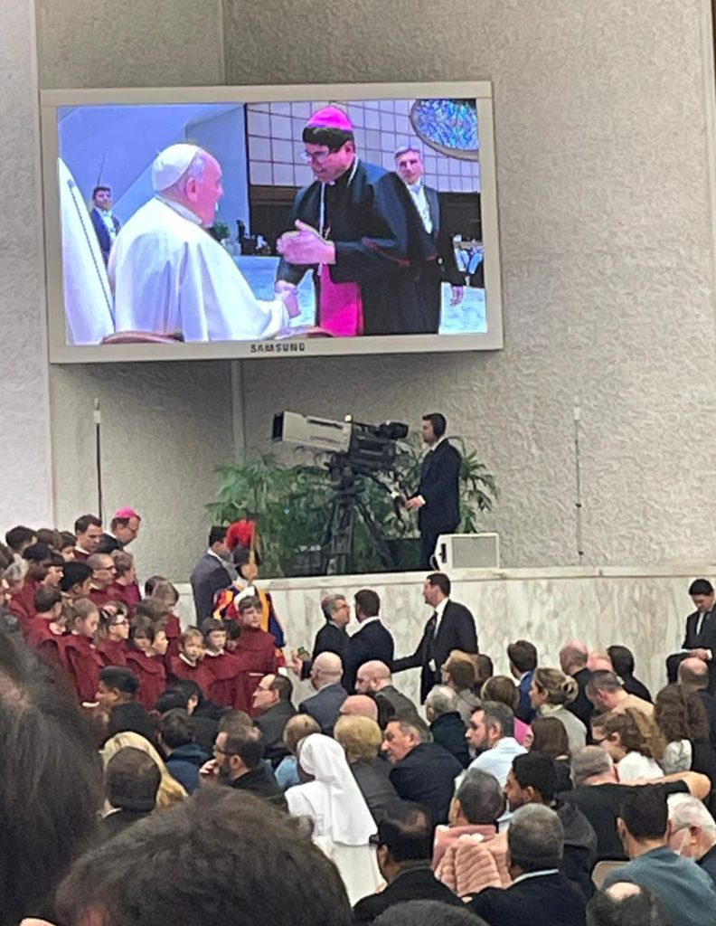 Il Vescovo Nicolò stringe la mano a Papa Francesco in Sala Paolo VI, e porta con sé il saluto degli oltre 100 pellegrini riminesi intervenuti.