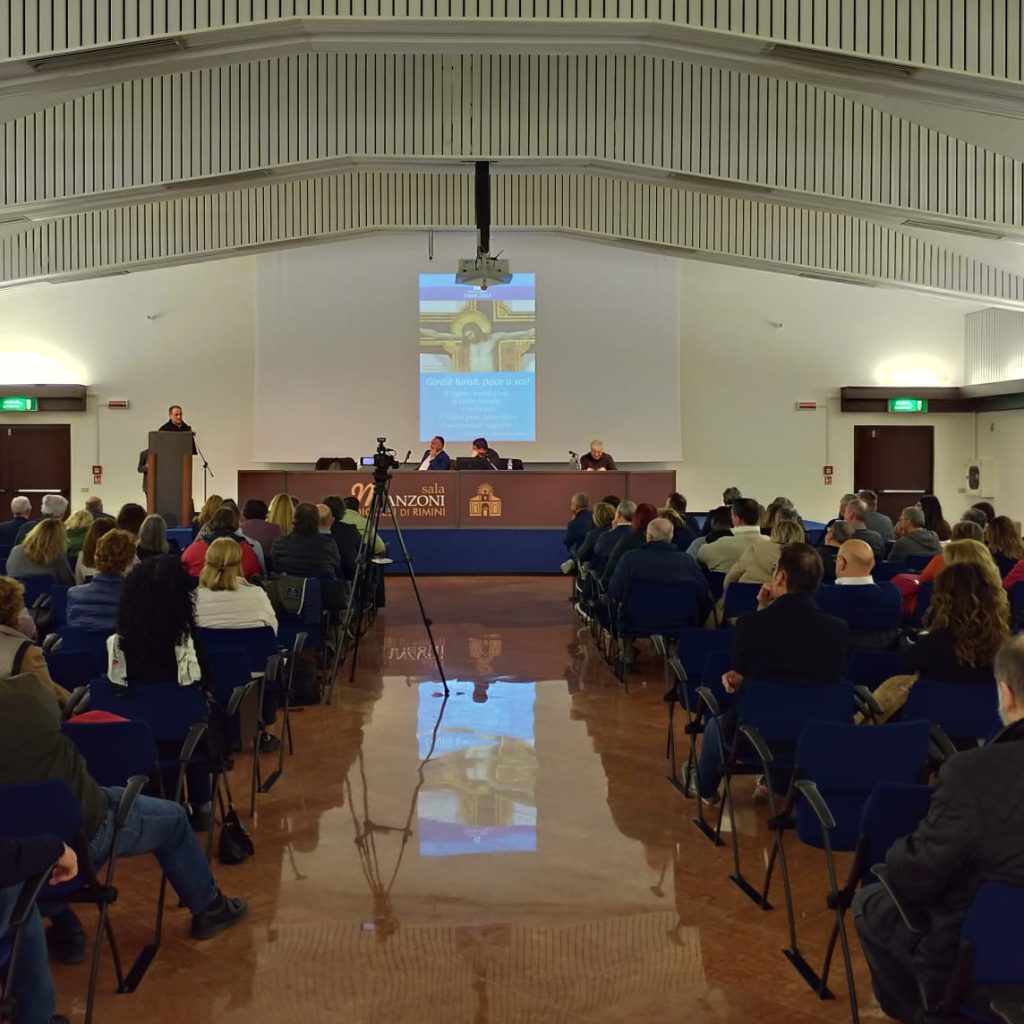 Sala Manzoni, a Rimini, a fianco della Basilica Cattedrale, era gremita di persone arrivate da tutta la Diocesi per questo incontro, il primo di questo genere organizzato espressamente dal Servizio Pastorale del Turismo e dal Vescovo.