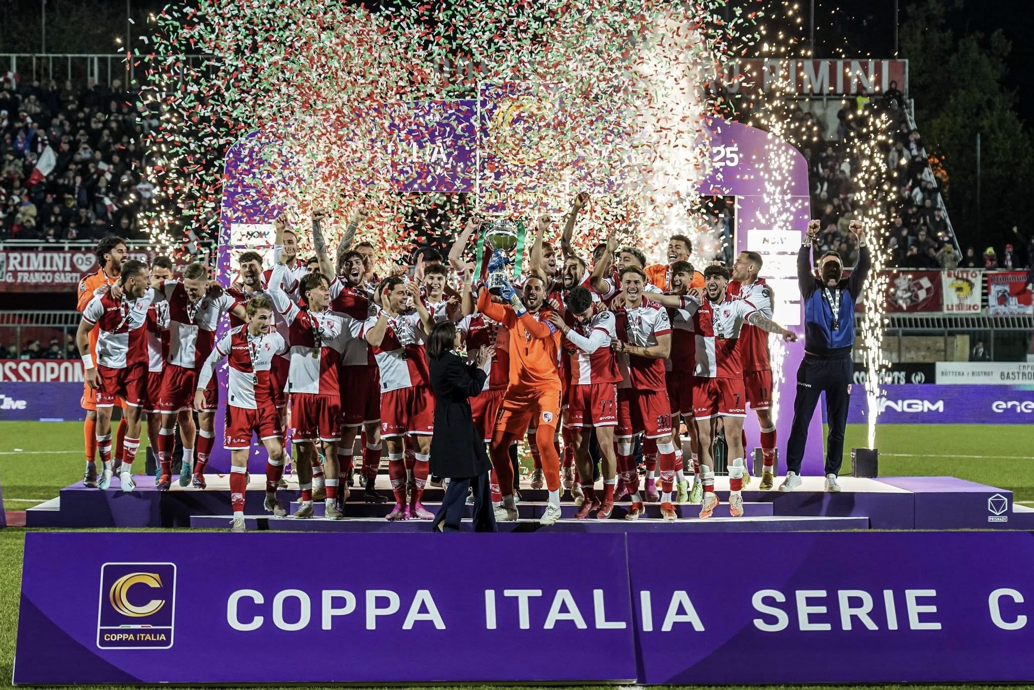 Il Rimini ha scritto un’altra pagina indelebile della sua storia. Martedì 8 aprile 2025, in un “Romeo Neri” dove non entrava più neppure uno spillo, la squadra di Antonio Buscé ha conquistato la sua prima Coppa Italia di Serie C. Lo ha fatto contro la Giana Erminio che non è riuscita a ribaltare lo 0-1 dell’andata firmato da Anto- nio Cioffi. Lo ha fatto al termine di un percorso lungo, lunghissimo, partito addirittura in agosto, e che, via via,