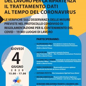 Ripartenza, riorganizzazione del lavoro e trattamento dei dati al tempo del Coronavirus. Un seminario formativo online organizzato dallo Studio Paci di Rimini fornirà spunti operativi e suggerimenti per gestire attività, rispettando i diritti e le libertà dei soggetti interessati.