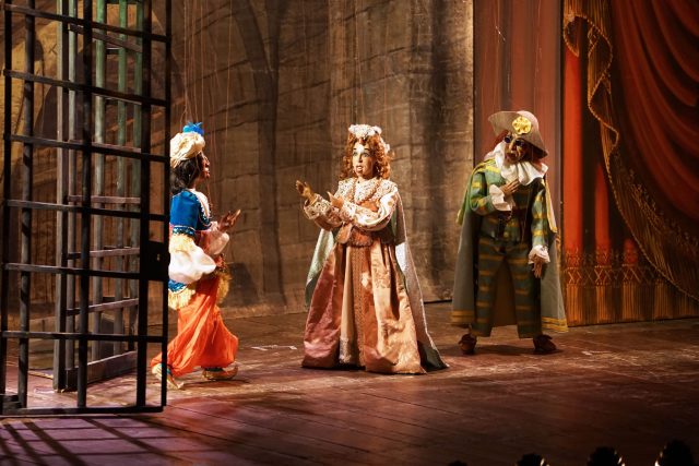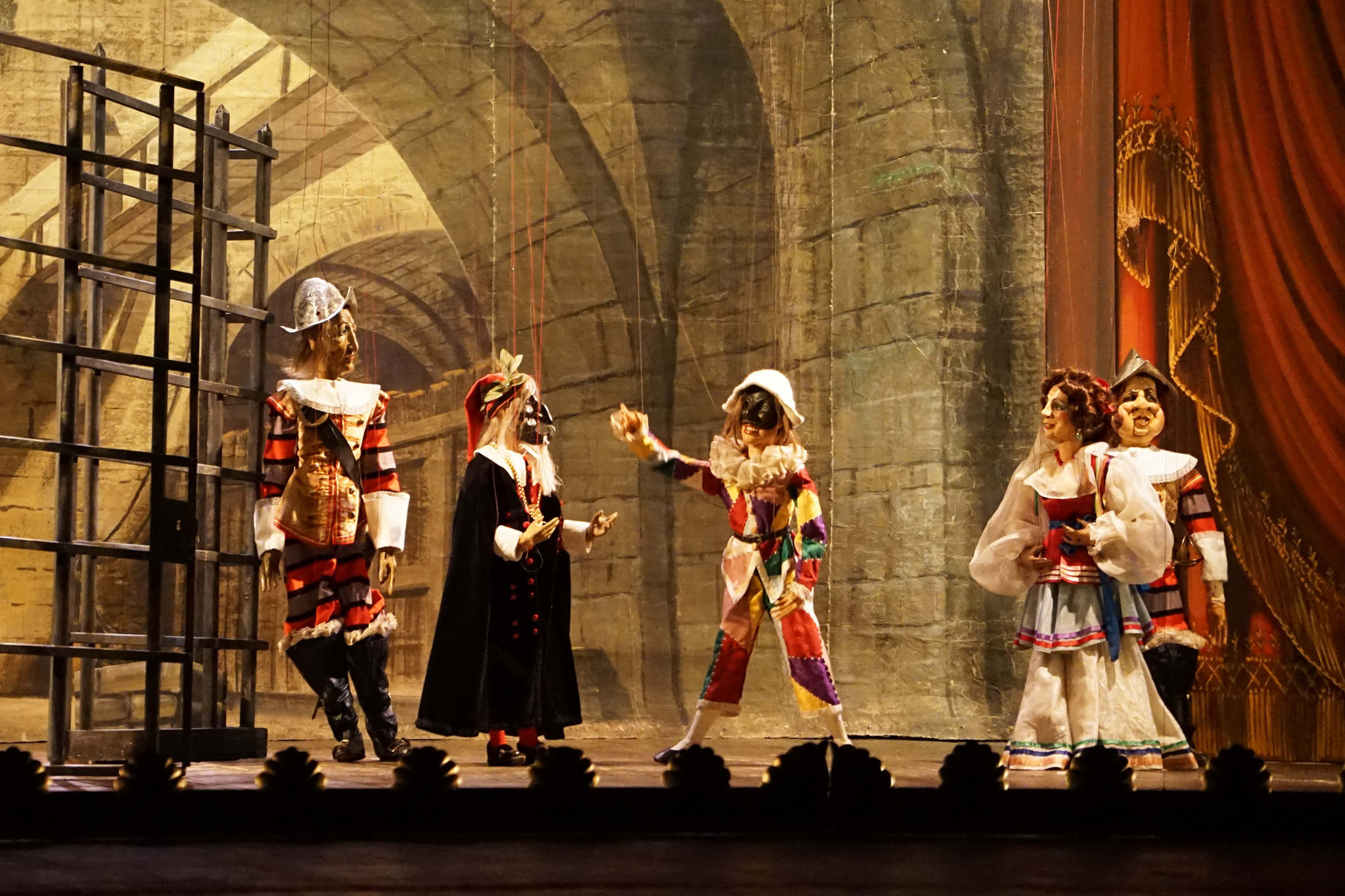 Le marionette si muovevano nel piccolo teatro collocato al centro del palcoscenico del Verdi, con i loro coloratissimi e fastosi costumi, creati appositamente dallo stesso Colla, mentre i continui cambiamenti di fondale (le magnifiche scene dipinte provenivano dal repertorio storico della Compagnia) scandivano il variegato andamento drammaturgico di questo dramma burlesco.