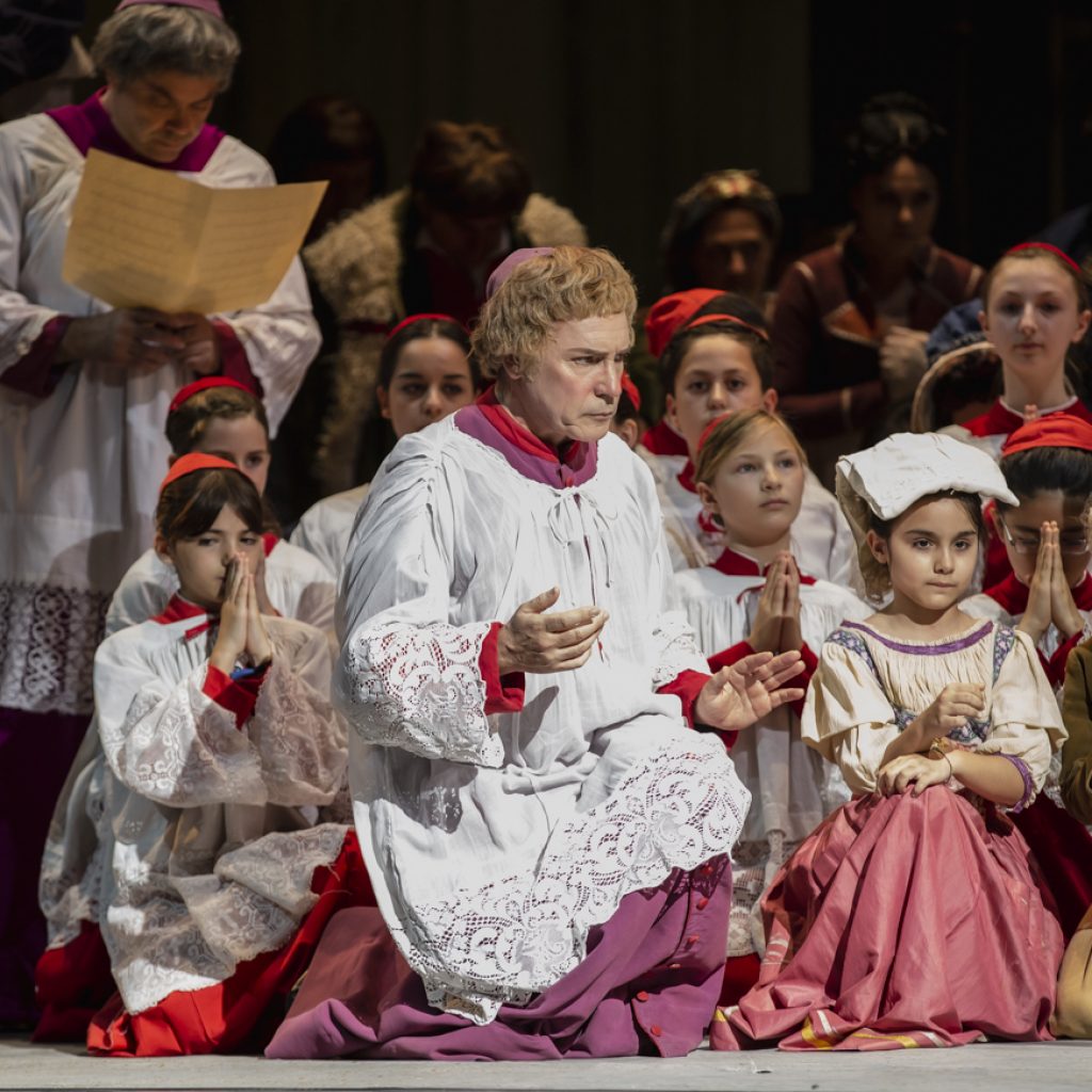 Questa ricostruzione delle scene e dei costumi originali di Adolf Hohenstein risale al 2015 (se ne sono fatti carico, con scrupolo e rigore filologico, Carlo Savi e Anna Biagiotti) e, da allora, Tosca in versione antica viene riproposta regolarmente ad ogni stagione. La regia è stata invece affidata ad Alessandro Talevi, che per l’occasione ha rinunciato a ogni intervento “dissacratore”, concentrando tutte le attenzioni sulla recitazione degli interpreti e sull’approfondimento del loro profilo psicologico. Al di là di quelli che sono i meriti dei singoli cantanti, ne scaturisce uno spettacolo esemplare per chiarezza, pur senza scivolare nel didascalico: uno di quegli allestimenti che andrebbero mostrati a studenti e neofiti per far capire le potenzialità del teatro operistico.