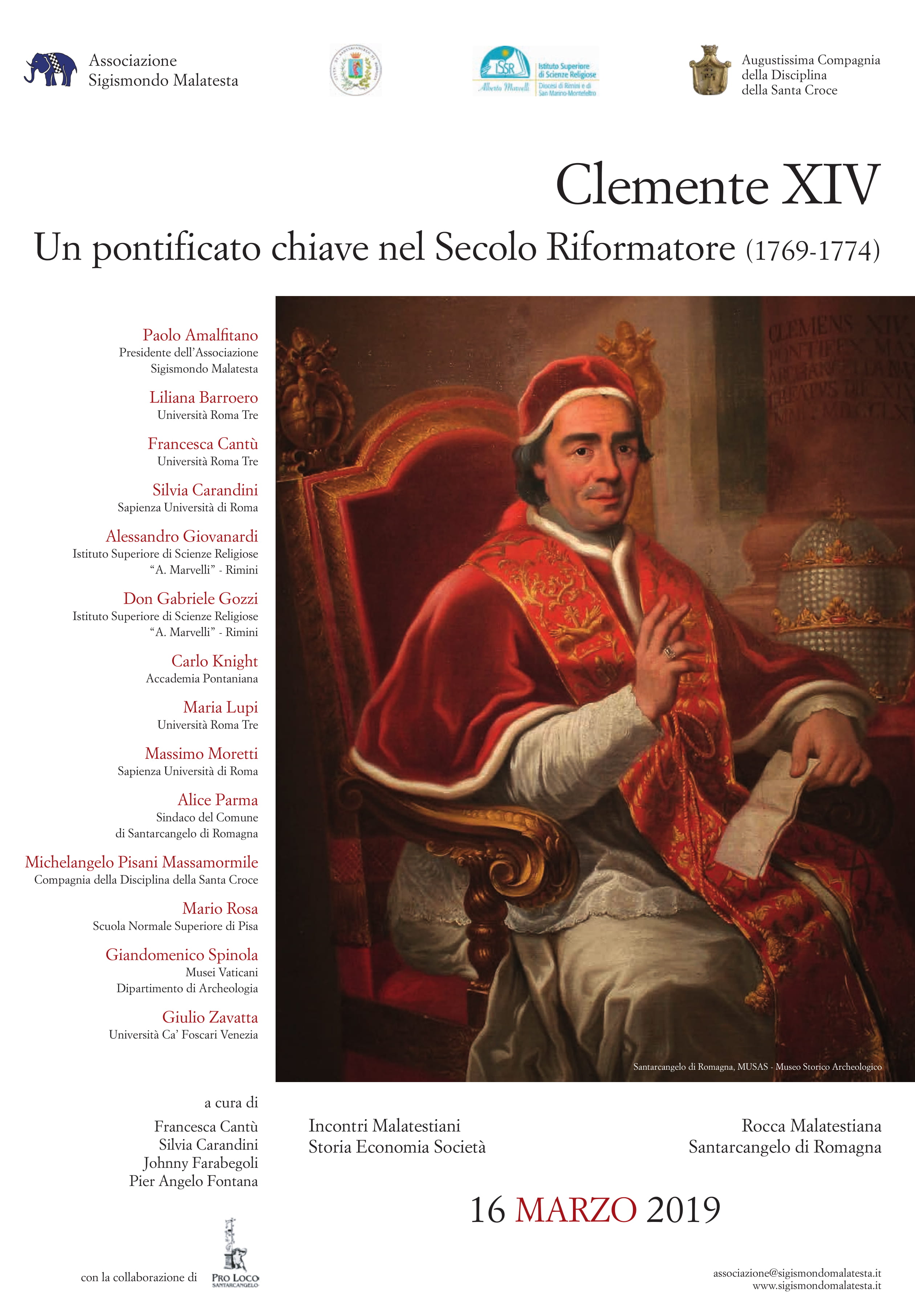 A 250 anni dalla elezione a Papa, Santarcangelo celebra il suo concittadino più illustre: Lorenzo Ganganelli, designato sommo pontefice col nome di Clemente XIV. La giornata di studi è programmata per sabato 16 marzo e si terrà presso la sala convegni della Rocca Malatestiana, sede dell’Associazione Sigismondo Malatesta, istituzione che da oltre 30 anni promuove incontri e iniziative in vari ambiti culturali in diverse città del nostro Paese. Promotori della manifestazione sono l’Associazione stessa, l’Amministrazione comunale, la Compagnia della Disciplina della Santa Croce di Napoli (di cui Papa Ganganelli ha fatto parte) e l’Istituto di Scienze Religiose Marvelli di Rimini, in collaborazione con la Pro Loco della città. I lavori sono la prosecuzione di un’analoga iniziativa tenutasi nello stesso luogo nel 2005, in occasione della ricorrenza dei 300 anni dalla nascita del Papa.