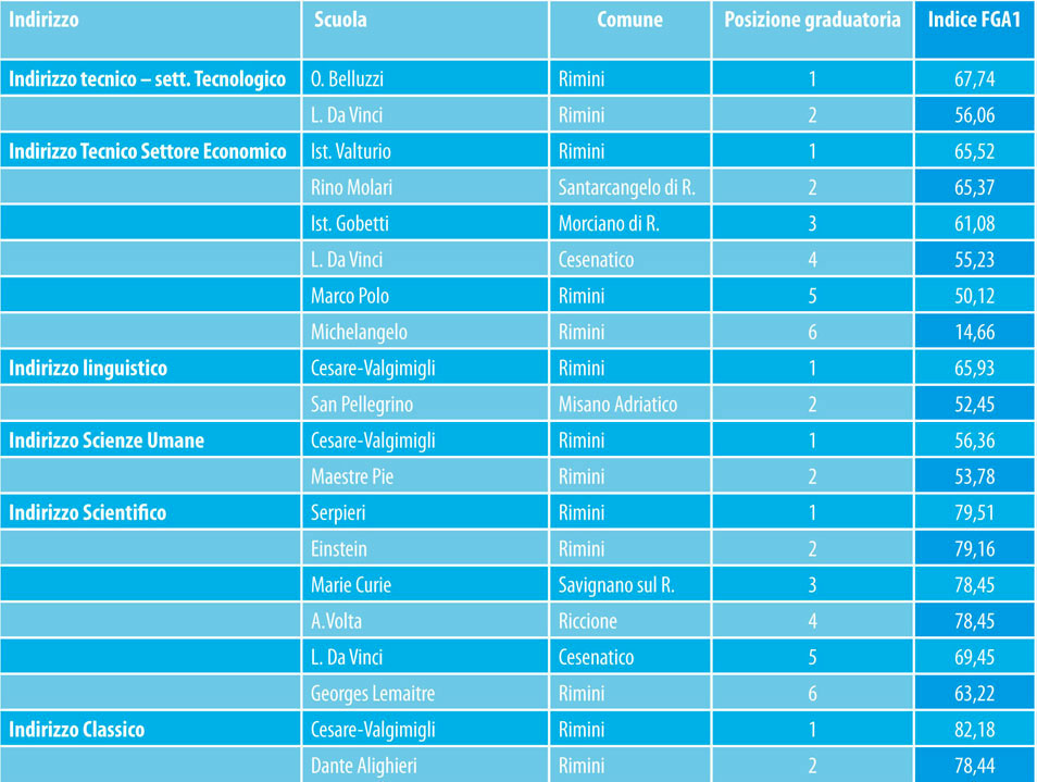Per il secondo anno consecutivo il progetto EDUSCOPIO della Fondazione Agnelli offre l’opportunità di elencare le migliori scuole del territorio, su dati degli anni accademici 2010/11 fino al 2012/13, con agli esami universitari sostenuti entro la primavera 2014, in base a tre semplici indicatori: il voto medio alla maturità degli immatricolati all’università; la media dei voti ottenuti all’università; i crediti ottenuti. Sono considerati solo gli studenti che, terminata la maturità, si iscrivono all’università. Questo non avviene in modo uniforme per tutti gli indirizzi, per cui si oscilla, rimanendo in provincia di Rimini, dal 93 per cento dell’indirizzo classico, a meno del 50 per cento dell’indirizzo tecnologico.