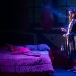 Lo spettacolo visto a Rimini, frutto di una coproduzione con il Teatro Alighieri di Ravenna, punta decisamente su una visualità contemporanea. Regia, scene e costumi sono di Roberto Magnani che concepisce un grande monitor esteso a tutto il boccascena, con animazioni fumettistiche sul fondale (regia video curata da Alessandro Tedde). Al centro un letto dal quale si alza Uberto, verosimilmente uno streamer intento a una diretta su qualche canale YouTube. Lo interpreta Paolo Leonardi – lunghe chiome fluenti e gesti un po’ annoiati – alle prese con una scrittura musicale per niente semplice, che richiederebbe notevole estensione (si è trovato a suo agio nel registro più grave). Non ha niente del maturo scapolone – forse un po’ misogino o, quanto meno, guardingo verso il genere femminile – tratteggiato nei versi di Gennarantonio Federico, tanto più che i sovratitoli permettono al pubblico di seguire passo dopo passo le parole del libretto.