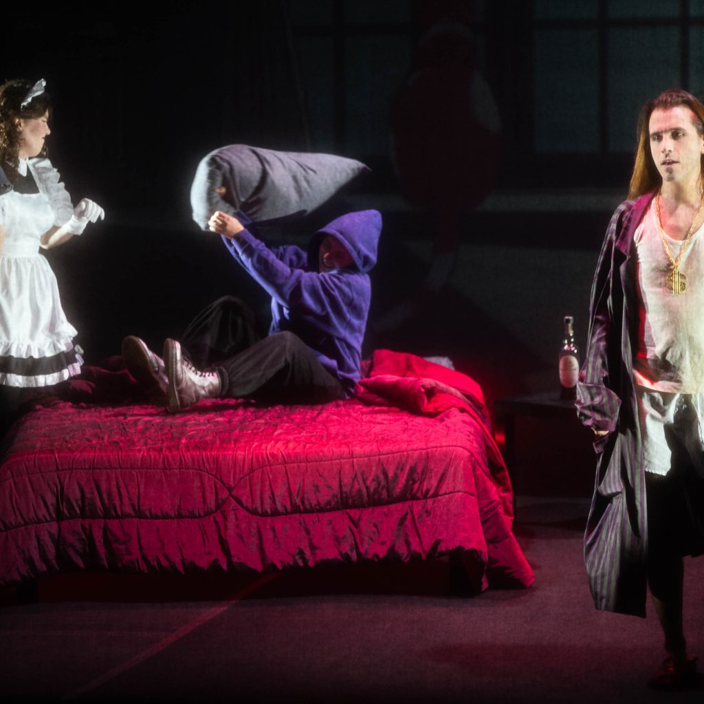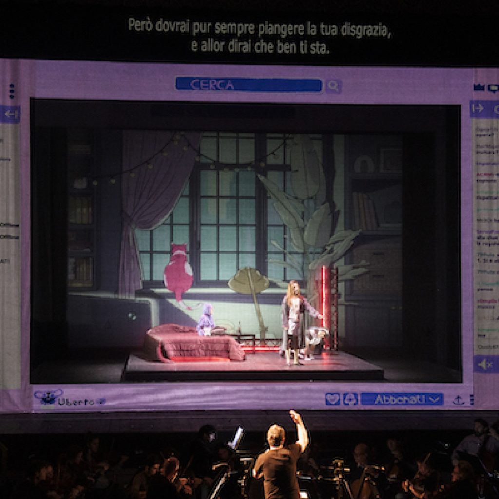 Lo spettacolo visto a Rimini, frutto di una coproduzione con il Teatro Alighieri di Ravenna, punta decisamente su una visualità contemporanea. Regia, scene e costumi sono di Roberto Magnani che concepisce un grande monitor esteso a tutto il boccascena, con animazioni fumettistiche sul fondale (regia video curata da Alessandro Tedde). Al centro un letto dal quale si alza Uberto, verosimilmente uno streamer intento a una diretta su qualche canale YouTube. Lo interpreta Paolo Leonardi – lunghe chiome fluenti e gesti un po’ annoiati – alle prese con una scrittura musicale per niente semplice, che richiederebbe notevole estensione (si è trovato a suo agio nel registro più grave). Non ha niente del maturo scapolone – forse un po’ misogino o, quanto meno, guardingo verso il genere femminile – tratteggiato nei versi di Gennarantonio Federico, tanto più che i sovratitoli permettono al pubblico di seguire passo dopo passo le parole del libretto.