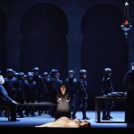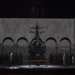 Lo spettacolo di Robert Carsen, in collaborazione con Luis F. Carvalho per scene e costumi, assegna a una vicenda del XII secolo una visualità insieme moderna e senza tempo, trasformando il lussureggiante giardino, dove avviene l’incontro tra i due amanti, nelle severe arcate di una moschea. Prevalgono le tonalità del grigio, a cominciare dall’abito di lei e dal talled – lo scialle di preghiera – che lascia cadere: il richiamo più esplicito a un immaginario ebraico. La regia dà poco risalto alla passione erotica e, mentre i due amanti giacciono sotto una coperta giallo-arancio (unica nota di colore dell’intero spettacolo), un fulmineo colpo d’occhio visualizzata tutta la disapprovazione per la colpevole coppia da parte di un prete, un rabbino e un iman, esponenti delle tre religioni coinvolte. Il finale, ad alto contenuto emotivo, crea un cortocircuito col presente e, mentre il vescovo benedice le armi, sullo sfondo scorrono filmati di guerra: allusione a quelle sedici ore di bombardamenti alleati che il devastarono Dresda tra il 13 e 14 febbraio 1945 e, adesso, si confondono con le immagini dei nostri attuali telegiornali. Quando la carneficina è completata, resta in piedi solo il figlio della coppia. Carsen trasforma questo adolescente ritardato in un bambino, ma già futuro adulto in giacca e cravatta. I suoi occhi sgranati di fronte all’orrore rappresentano l’ipoteca più tremenda sul futuro.