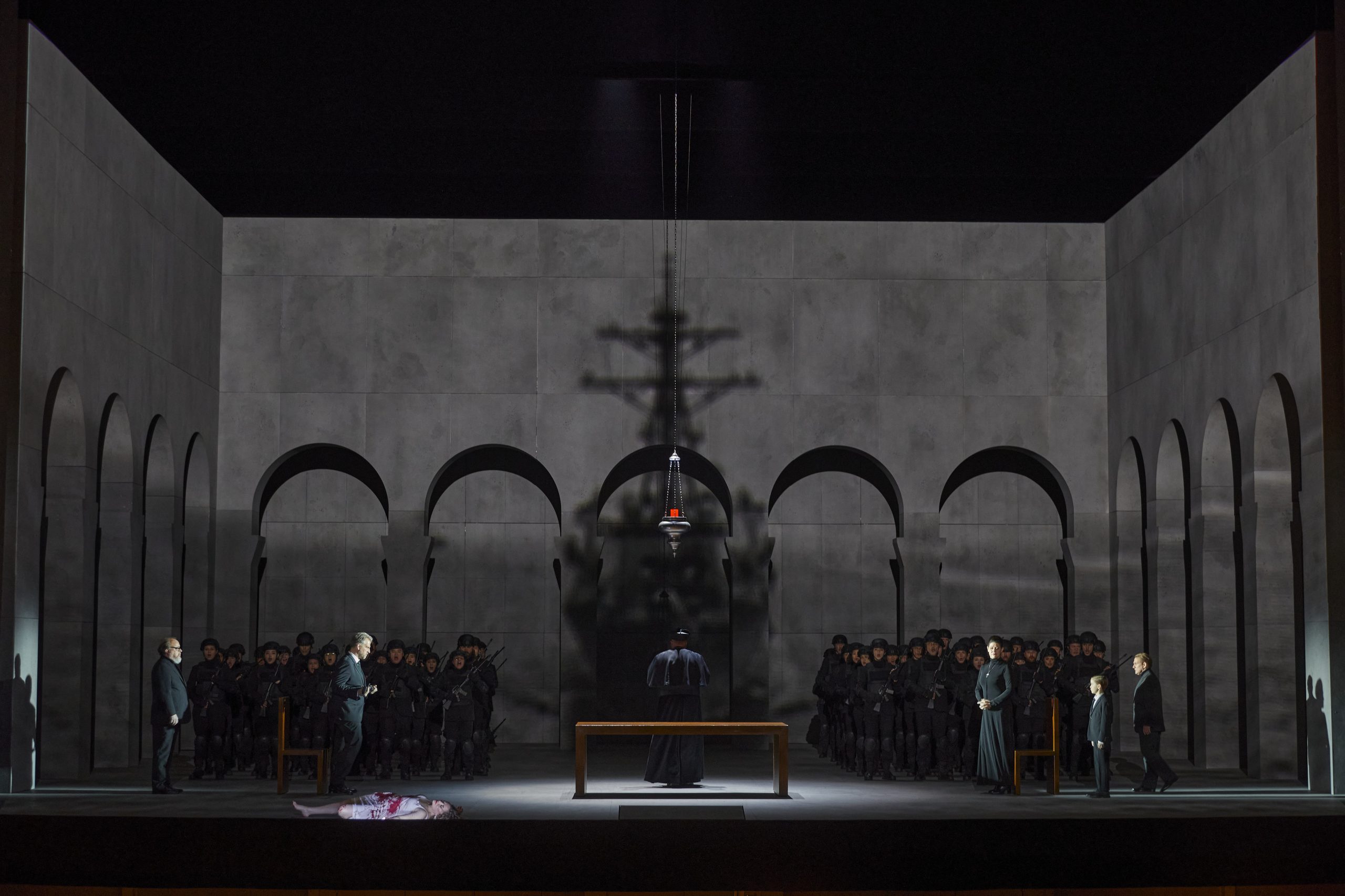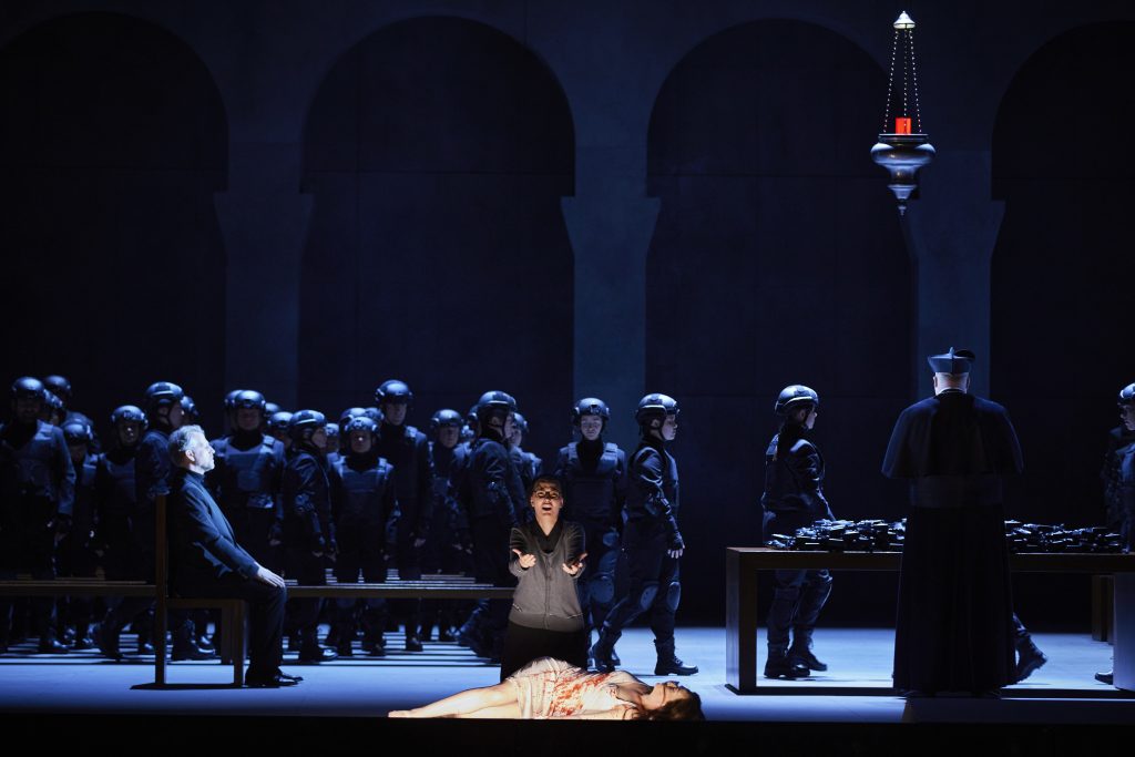 Lo spettacolo di Robert Carsen, in collaborazione con Luis F. Carvalho per scene e costumi, assegna a una vicenda del XII secolo una visualità insieme moderna e senza tempo, trasformando il lussureggiante giardino, dove avviene l’incontro tra i due amanti, nelle severe arcate di una moschea. Prevalgono le tonalità del grigio, a cominciare dall’abito di lei e dal talled – lo scialle di preghiera – che lascia cadere: il richiamo più esplicito a un immaginario ebraico. La regia dà poco risalto alla passione erotica e, mentre i due amanti giacciono sotto una coperta giallo-arancio (unica nota di colore dell’intero spettacolo), un fulmineo colpo d’occhio visualizzata tutta la disapprovazione per la colpevole coppia da parte di un prete, un rabbino e un iman, esponenti delle tre religioni coinvolte. Il finale, ad alto contenuto emotivo, crea un cortocircuito col presente e, mentre il vescovo benedice le armi, sullo sfondo scorrono filmati di guerra: allusione a quelle sedici ore di bombardamenti alleati che il devastarono Dresda tra il 13 e 14 febbraio 1945 e, adesso, si confondono con le immagini dei nostri attuali telegiornali. Quando la carneficina è completata, resta in piedi solo il figlio della coppia. Carsen trasforma questo adolescente ritardato in un bambino, ma già futuro adulto in giacca e cravatta. I suoi occhi sgranati di fronte all’orrore rappresentano l’ipoteca più tremenda sul futuro.
