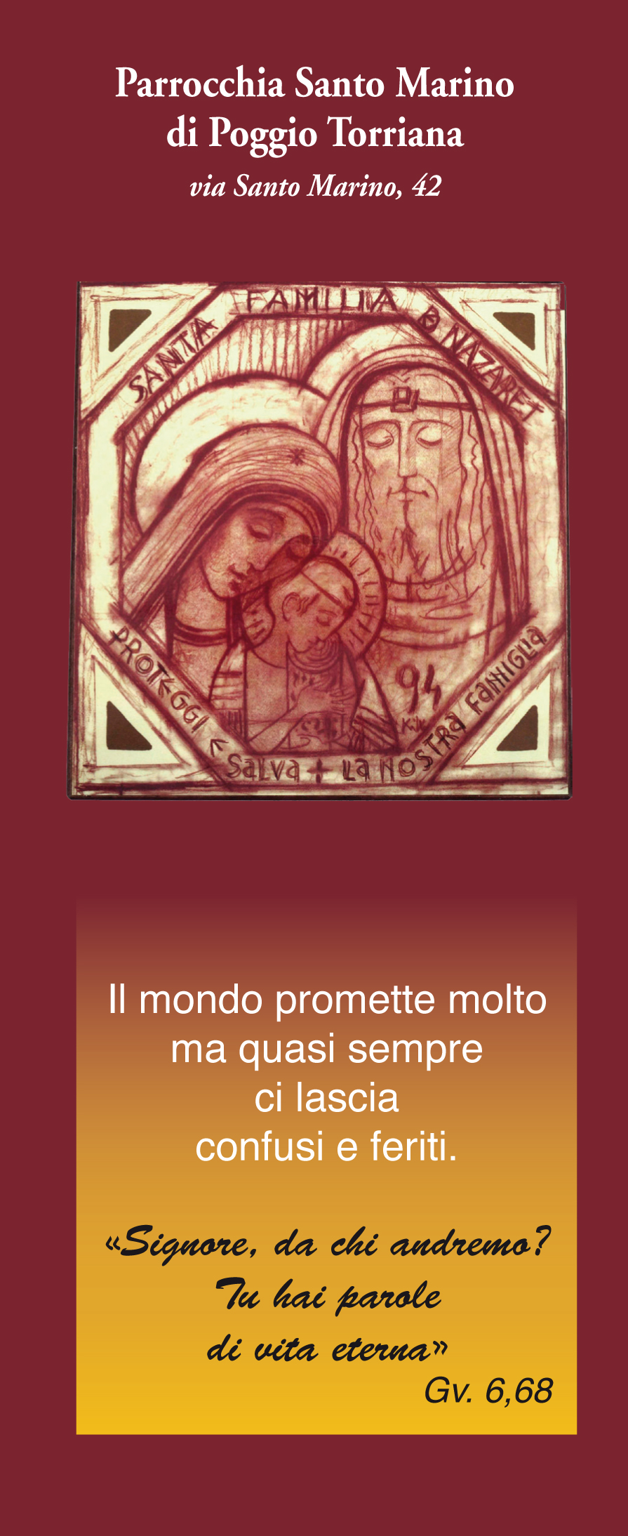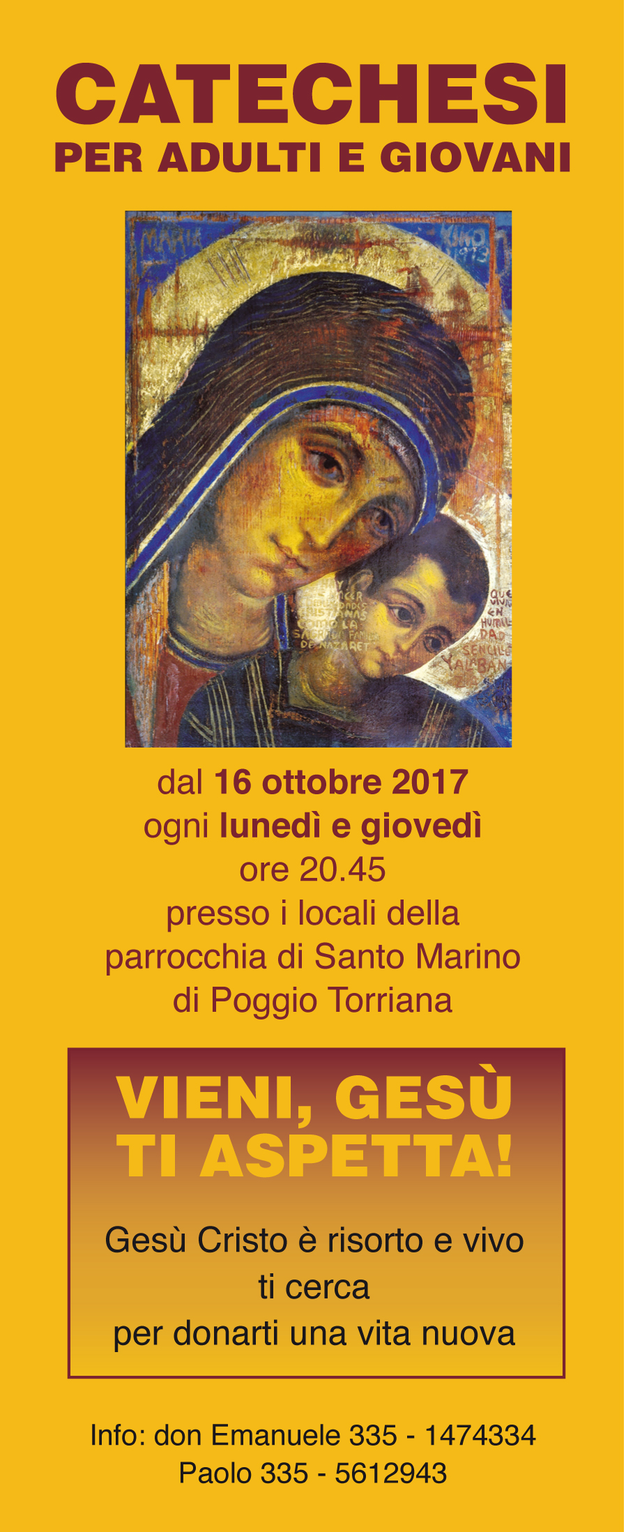 Rifacendosi alle parole dell’evangelista Giovanni, la parrocchia Santo Marino di Poggio Torriana (via S. Marino, 42) propone una catechesi per giovani e adulti dal 16 ottobre. Ogni lunedì e giovedì alle ore 20.45 presso i locali della parrocchia un incontro sui temi della vita e sulla Buona Notizia di Gesù (Per informazioni: don Emanuele Giunchi cell. 335.1474334, Paolo cell. 335.5612943). A condurre questa serie di incontri (durata 1 ora circa ogni serata, con possibilità di baby sitteraggio per le coppie che ne necessitano) c’è lo stesso parroco, don Emanuele, accompagnato da due giovani coppie di sposi e da due ragazze laiche, pronte a testimoniare con la loro esperienza la bellezza e la gioia, la ricchezza e la profondità dell’incontro con Cristo nella vita e la luce che ne scaturisce nelle scelte quotidiane.