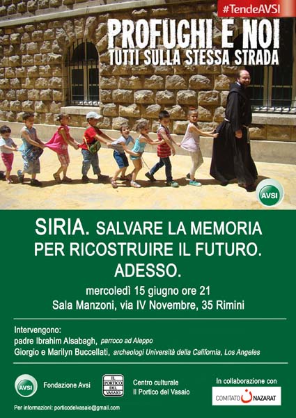 Dal 2011 ad oggi la guerra in Siria ha ucciso 250mila persone secondo i dati ufficiali (in realtà se ne stimano molte di più): tra le 100 e le 200 ogni giorno. A Rimini la Fondazione AVSI e il Centro culturale Il Portico del Vasaio, in collaborazione con il Comitato Nazarath, organizzano per mercoledì 15 giugno, alle ore 21 in Sala Manzoni (via IV Novembre, 35) un incontro pubblico dal titolo “Siria: salvare la memoria per ricostruire il futuro. Adesso”. Al centro della serata tre testimonianze eccezionali sulla drammatica attualità di un paese massacrato da cinque anni di guerra e sulla lotta quotidiana per non perdere i segni del passato. Interverranno, infatti, Padre Ibrahim Alsabagh, parroco ad Aleppo, e Giorgio e Marilyn Buccellati, due dei più famosi archeologi al mondo, scopritori dell’antica città siriana di Urkesh.