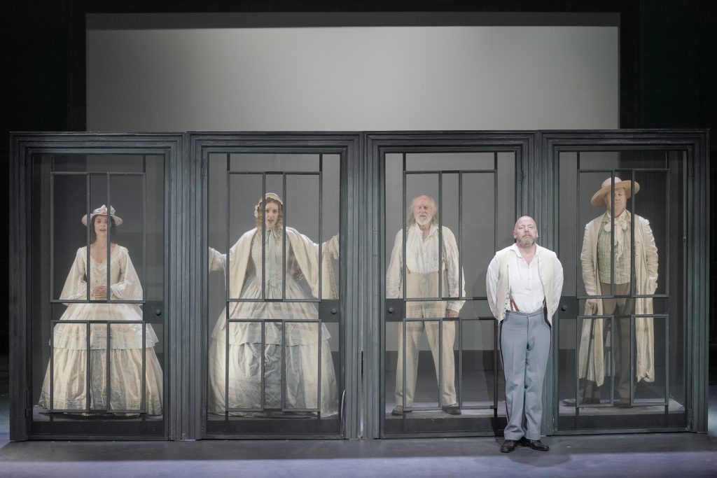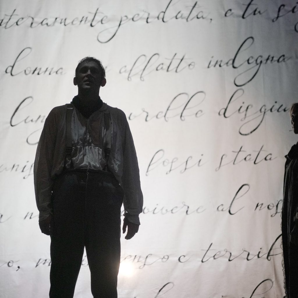 Lo spettacolo di Warner – che a Montepulciano già firmò un indimenticabile Albert Herring di Britten – mette ben a fuoco la personalità della protagonista. Senza tener conto delle numerose indicazioni del libretto che pongono l’accento sul suo aspetto sgradevole, la raffigura come una donna un po’ sfiorita ma ancora avvenente – tale, del resto, doveva apparire a Giorgio, che un po’ alla volta cade nella sua rete – e, unico tratto in grado di sottolinearne la diversità, in palcoscenico è la sola interprete a essere amplificata. Grazie al contributo di Ashley Martin-Davis, che costruisce una scena essenziale, ma non per questo meno efficace nel disegnare i diversi ambienti (è il caso del treno, reso con delle semplici sedie), e ai bei costumi ottocenteschi di Tom Rand, lo spettacolo è molto bello da vedere.