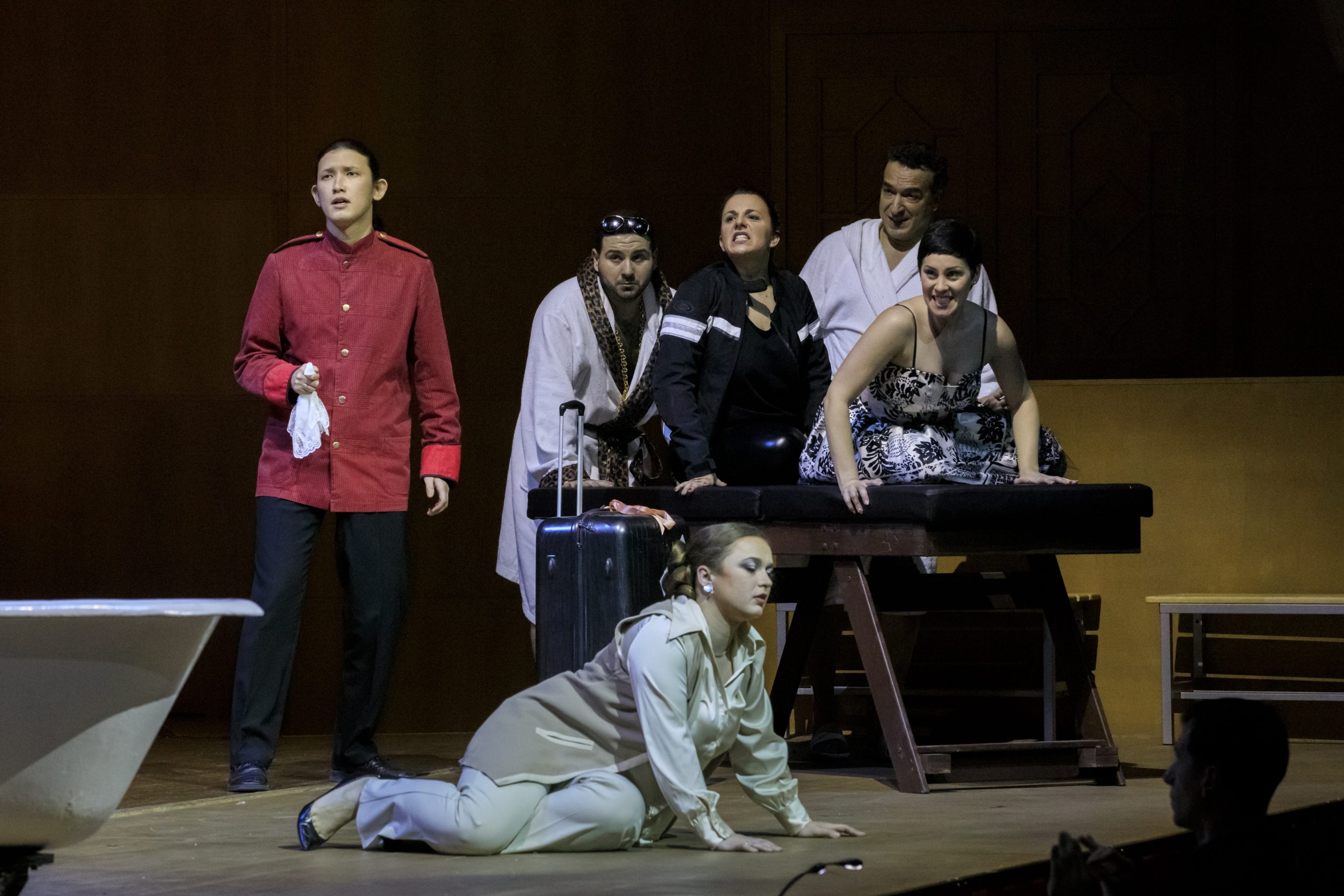 Lascia invece perplessi il versante visivo, tanto più che l’eleganza un po’ algida della lettura musicale entra in rotta di collisione con la ‘mise en espace’ di Gianmaria Aliverta. In luogo della locanda goldoniana, il regista delinea con pochi oggetti di scena una moderna spa di cui usufruiscono i tre ospiti in accappatoio bianco, mentre si contendono le grazie della padrona. Purtroppo la caratterizzazione dei personaggi appare eccessivamente farsesca rispetto a una musica, come quella di Martinů, che punta soprattutto a valorizzare la bellezza dei dialoghi e il fascino del teatralissimo ingranaggio.