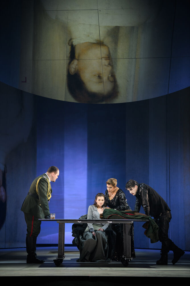 Direttore e regista, consapevoli come uno dei vertici dell’opera sia lo scontro tra il Conte di Walter e il suo castellano Wurm, hanno posto grande attenzione a questa pagina: un duetto tra due bassi – che Fischer fa siglare da un patto di sangue – destinato a diventare un modello musicale per tanto Verdi futuro (Luisa Miller precede di poco la ‘Trilogia popolare’). Nei panni del Conte, il monumentale Alexaner Grassauer ha sfoggiato voce compatta e sempre omogenea: forse più avvezzo alle granitiche sonorità wagneriane che alla morbidezza del fraseggio verdiano, si è imposto con facilità sull’orchestra. Gli teneva testa un insinuante Levente Páll, dall’aspetto sinistro e dai modi viscidi: il malvagio Wurm – in italiano la parola significa verme – che in precedenza aveva strisciato fino alla borsetta abbandonata della duchessa Federica (Anna Agathonos, non sempre a fuoco vocalmente ma di grande resa scenica nel ruolo di pretendente ricca e matura), fiutando quell’oro che forse poteva contenere, in un rimando quasi wagneriano. E sono state davvero sequenze di notevole teatro.