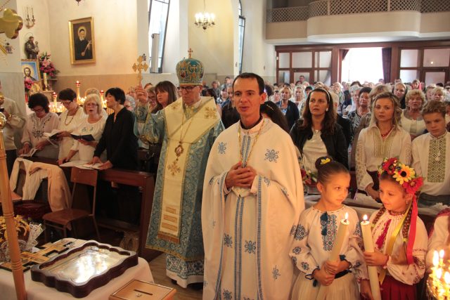 All’inizio della celebrazione liturgica il vescovo Dionisio è stato accolto con affetto dai bambini ucraini e dal cappellano della comunità don Viktor Dvykalyuk.