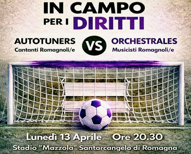 Lunedì 13 aprile alle ore 20.30 allo stadio “Valentino Mazzola” di Santarcangelo di Romagna si sfideranno Autotuners (cantanti romagnoli) e Orchestrales (musicisti romagnoli), insieme ad un gruppo di calciatrici, tra cui giocatrici del Cesena Calcio Femminile e dell’ex Rimini Calcio Femminile.