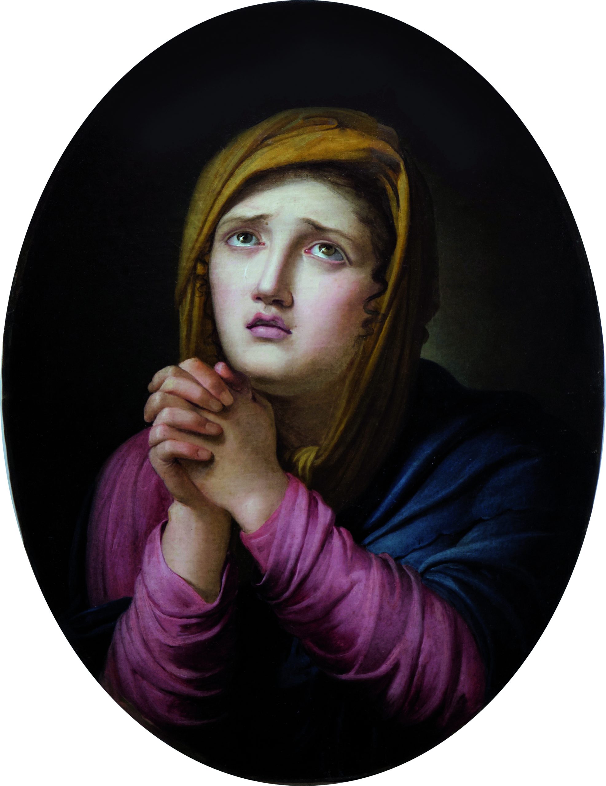 Il dipinto è ovale e alto poco più di 60 centimetri, dunque è di dimensioni molto modeste; ma è bellissimo, cioè ha forme scelte e finemente eseguite ed è straordinariamente espressivo. Rappresenta la Madonna addolorata, che è un tipo di madonna un po’ fuori moda oggi, ma che è ben coerente con la figura di Maria mentre assiste alle sofferenze e alla morte del Figlio.