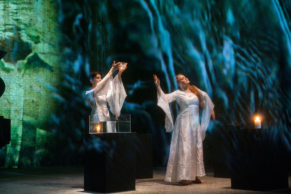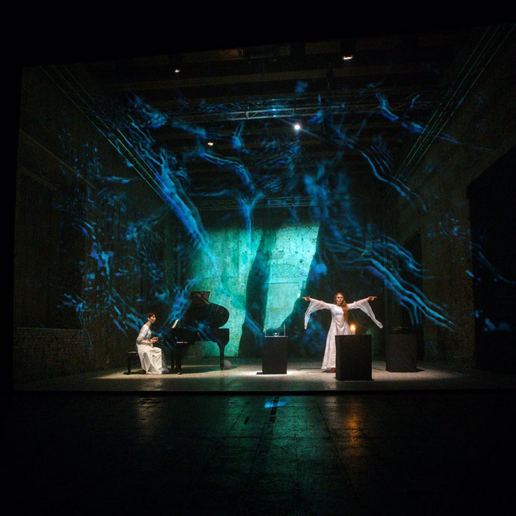 La semplice ed efficace realizzazione scenica dei video-artisti Luca Brinchi e Daniele Spanò ha ben valorizzato, in Tierkreis, il contributo della tedesca Lässing e dell’altro soprano Elisa Prosperi, entrambe molto brave ed espressive, capaci anche di destreggiarsi con disinvoltura al pianoforte. Grazie a un segno visivo nitido e bello a vedersi – con riferimenti ad aria, terra, acqua, fuoco – e a un sapiente gioco di luci, l’impatto di queste dodici melodie diventa molto forte. Non è però solo l’aspetto visuale, peraltro inscindibile da quello sonoro, a coinvolgere l’ascoltatore: c’è, soprattutto, il profondo senso teatrale sotteso da questa musica.