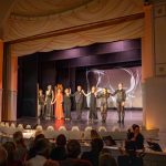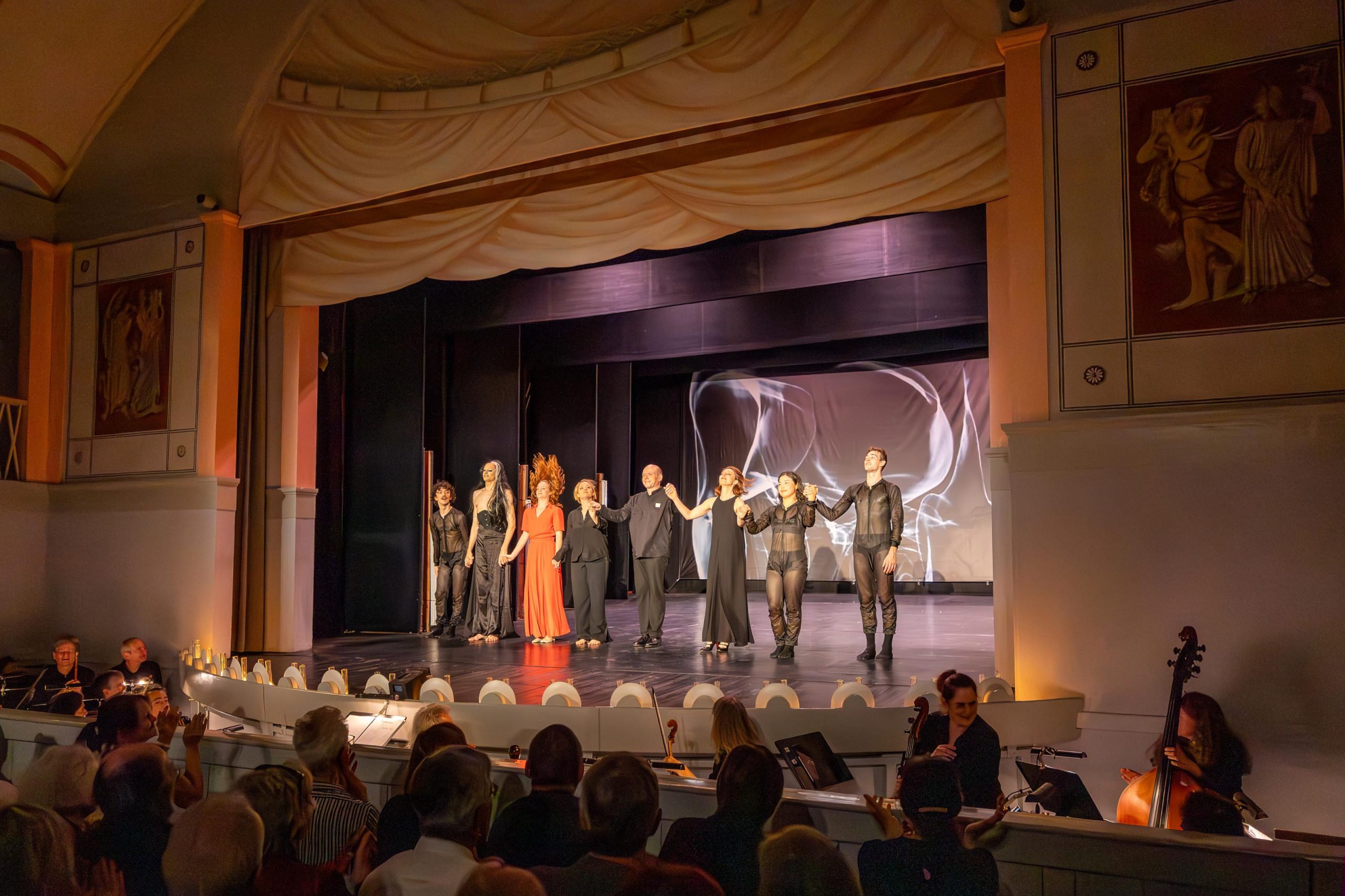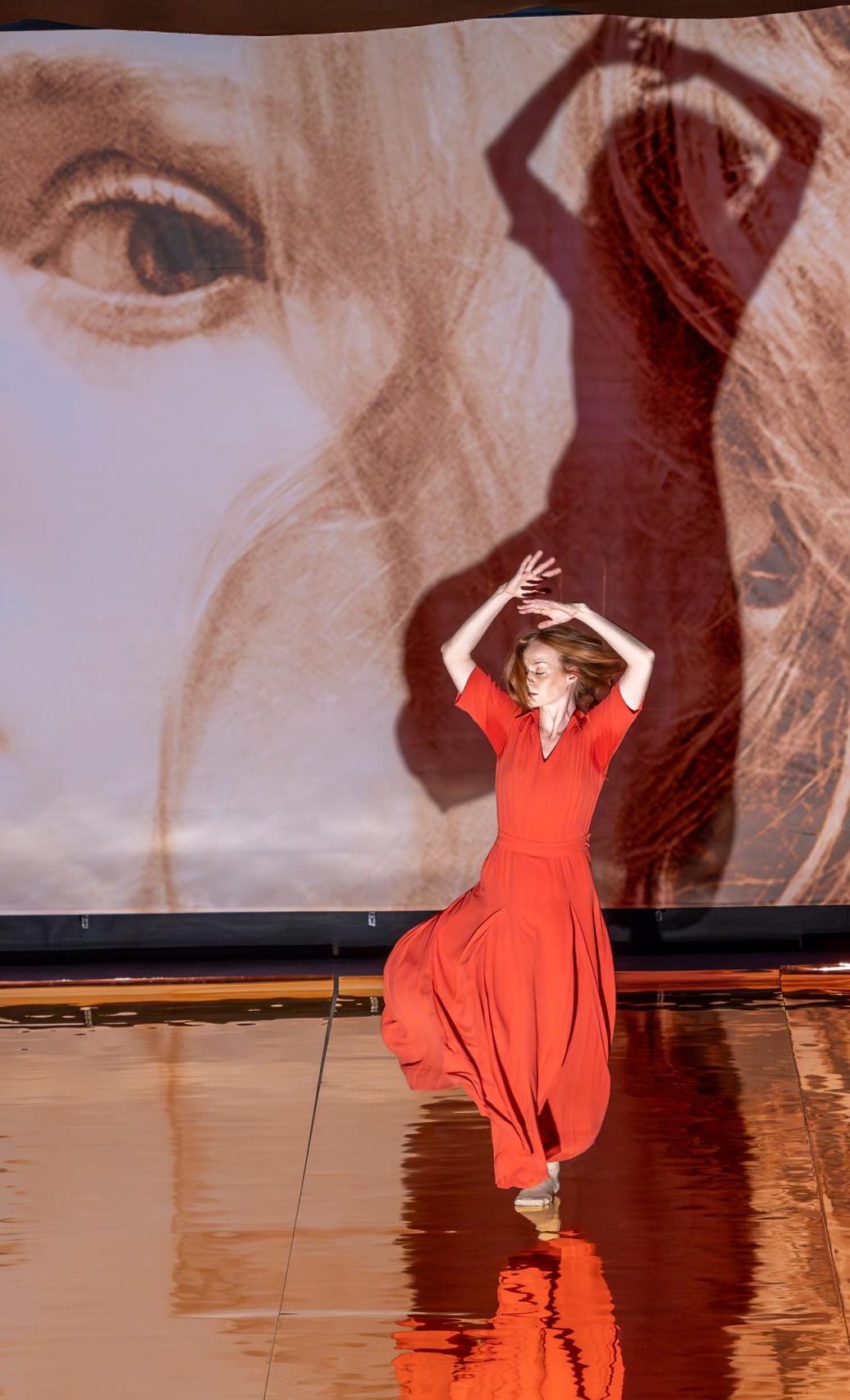 Sul palcoscenico del Goethe Theater, e talvolta in altre postazioni della sala, si sono alternate le due cantanti. Nei panni di Erato il bravissimo soprano Hanna Herfurtner, oltre a sfoggiare notevoli mezzi, voce piena e corposa, si è trovata sempre perfettamente a suo agio in una scrittura che richiede un notevole dominio delle agilità. Ad affiancarla, il mezzosoprano (ma con un’estensione in gran parte anche sopranile) Coline Dutilleul, solida artista che ha disegnato un Apollo debitamente peroratorio. La danzatrice Lisa Kirsch, avvolta in un abito arancione, ha dato invece forma al personaggio eponimo di Tersicore, imponendosi per la fluidità dei gesti, concepiti per destrutturare le forme più tradizionali del balletto e aggiornarle a un’originalissima forma di teatro-danza. Per coadiuvare il suo intervento sono intervenuti altri tre danzatori della compagnia: Federico Casadei e Lorenzo Molinaro, insieme alla coreana Taeyeon Kim.