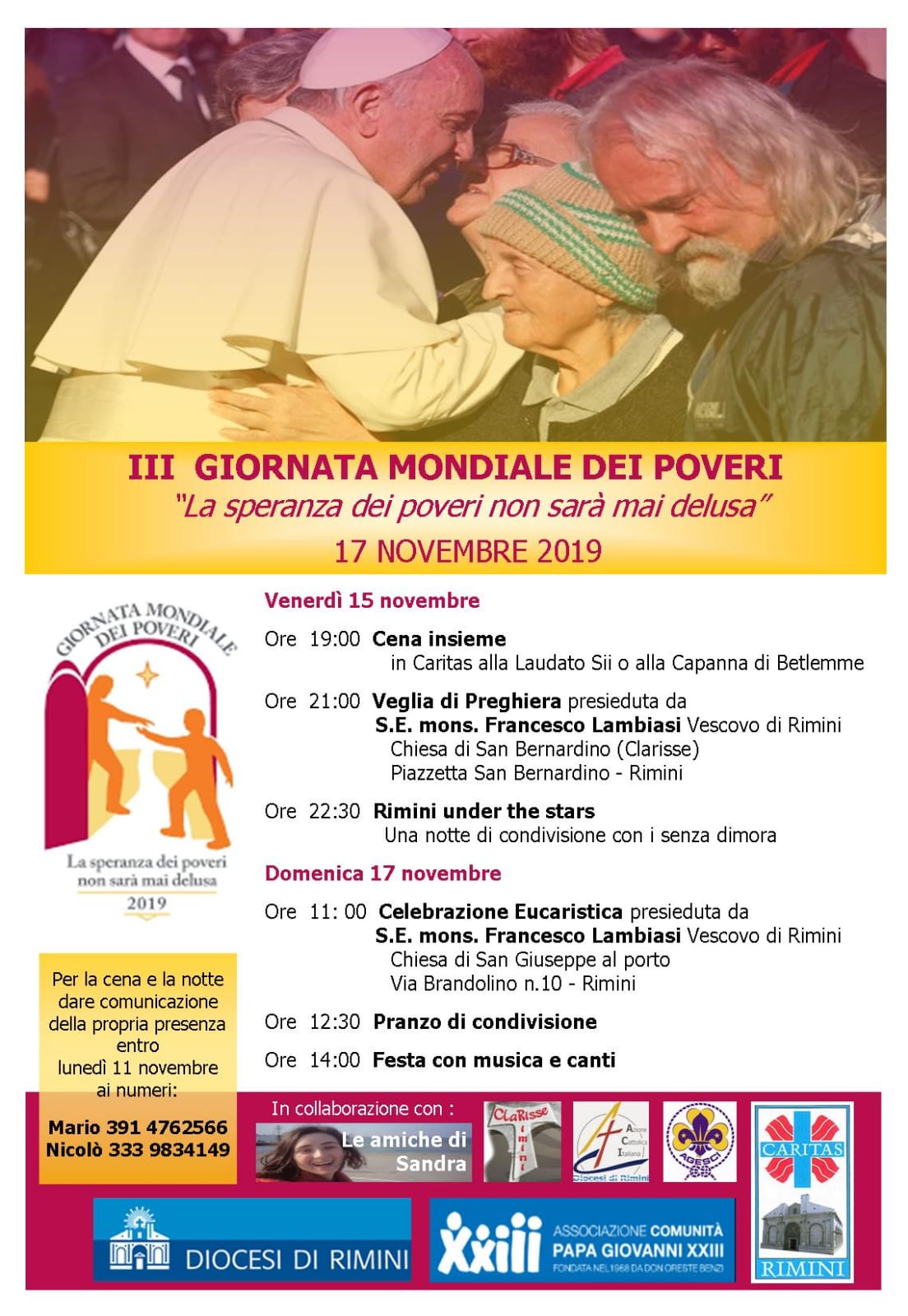 La Diocesi di Rimini celebra la Giornata, intitolata “La speranza dei poveri non sarà mai delusa”, con un evento diocesano domenica 17 novembre 2019, rivolto in particolare ai poveri della città di Rimini, invitando inoltre calorosamente tutte le comunità ecclesiali a programmare eventi e progetti.