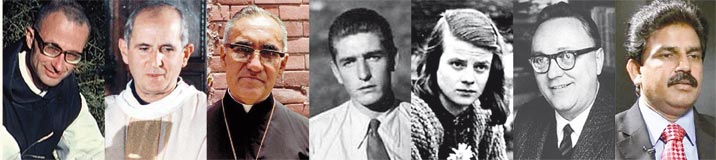 Nelle foto da sinistra: dom Christian de Chergé, don Pino Puglisi, mons. Oscar Romero, Alberto Marvelli, Sophie Scholl, Vittorio Bachelet, Shahbaz Batthi